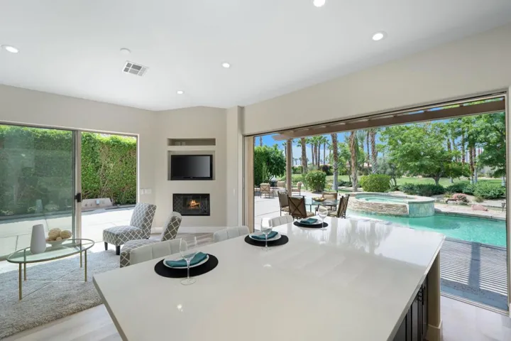 Luxury RV Resort – Newly remodeled Desert Shores Resort property!Newer kitchen countertops, newer vinyl plank floors, new bathroom, baseboards, epoxy floor and split-system air in garage.Covered patio and pool, spa and firepit!Western Exposure Property at Desert Shores. Pool & Spa! Association includes clubhouse, tennis, fitness , pickleball, community pool & spa, social activities, 24 hour, guard gated with high-tech perimeter security, trailer storage area, doggie park, front yard landscape maintenance & brand new super-speed FIOS internet