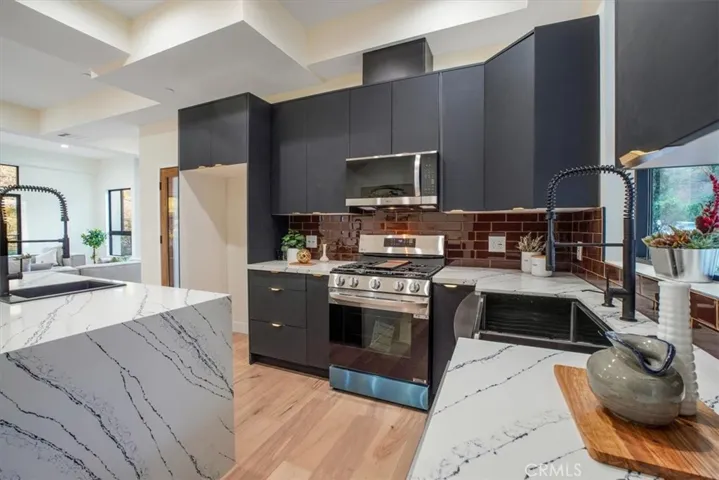 Living: The expansive living and dining area boasts large windows, flooding the space with natural light. • Chef’s Kitchen: Sleek, modern appliances, and an