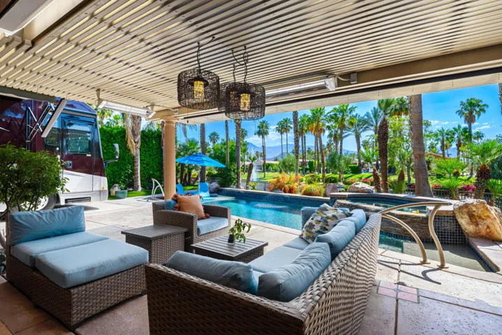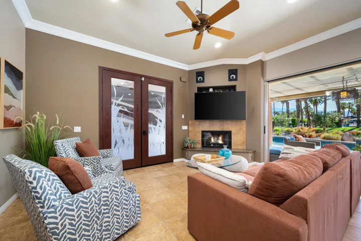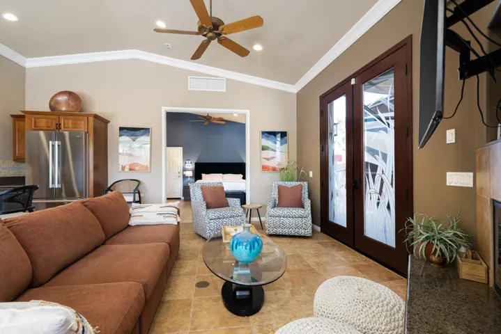 Luxury RV Resort On-Site Office -Furnished property at Desert Shores Resort.Popular Plan 20 floor plan with spacious retreat with en suite and walk-in closet.Private location with afternoon sun.BBQ & Granite High-Top Table. Pool & Spa with double quartzite spillways! Very nice center-lake property located on Lake 2 with Fountain & Mountain Views! Double-Door Entry to Villa.The kitchen is equipped with maple cabinets and stainless-steel appliances including a refrigerator, oven range, dw microwave, trash compactor, and under-counter beverage fridge + clear-ice maker.Corner Fireplace with stacking glass doors to patio.Newer high-efficiency/output gas pool heater.Spacious rooms offer Crown Molded Ceilings and chiseled Porcelain Floors throughout.Association includes clubhouse, tennis, ,pickleball fitness center, community pool & spa, social activities, 24 hour, guard gated with high-tech perimeter security, trailer storage area, doggie park, front yard landscape maintenance & brand new super-speed FIOS internet