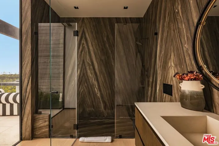 Introducing TerraLume, Malibu’s newest iconic estate nestled within the ultra-exclusive Point Dume enclave. Spanning 2.25 acres of pristine grounds with commanding panoramic ocean views, this 8,500 sq ft, 6-bedroom, 8-bathroom masterwork offers the pinnacle of architectural sophistication and resort-style living. A harmonious fusion of contemporary design and materials, TerraLume features board-formed concrete walls, curated stone finishes, and floor-to-ceiling disappearing glass doors that seamlessly blend indoor and outdoor living. Highlighting Malibu’s legendary sunsets at every turn. Enter through a tranquil lagoon to a grand 8×10 custom copper pivot door, leading into a dramatic double-height entry and voluminous open spaces. Every detail has been hand-selected for its artistry: handmade chandeliers, handcrafted wood louvers, etched copper walls, and a bespoke Italian kitchen. The floating staircase ascends to a private upper level featuring an opulent primary suite with two fireplaces, a spa-inspired bath retreat with hand-carved marble vanities, a sculptural stone soaking tub, and a steam shower framing unforgettable ocean vistas. Outdoor amenities rival world-class resorts: a covered outdoor kitchen and bar, 70-foot pool and spa, detached guesthouse, fitness studio with sauna, and gated motor court with parking for up to 20 vehicles. Enjoy private access to Little Dume Beach through the coveted Riviera III beach key.