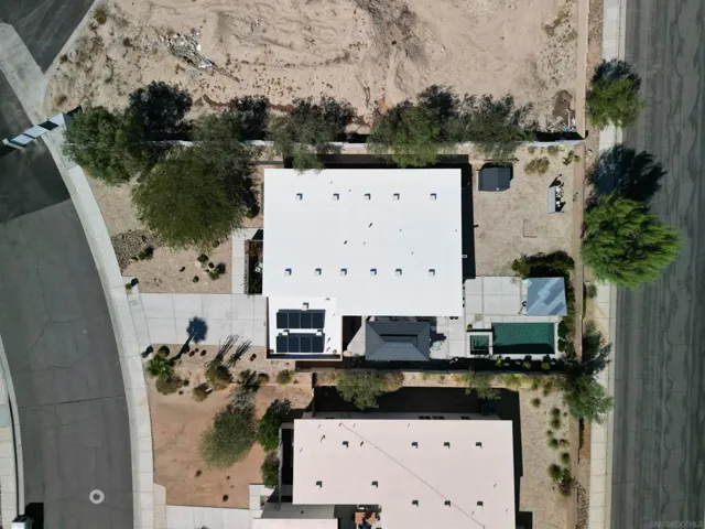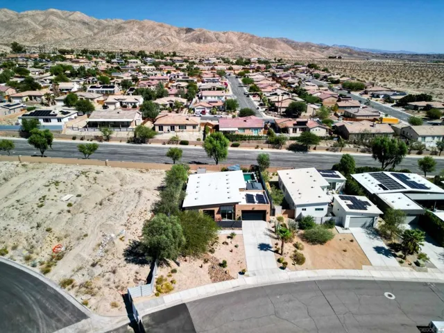 Eligible for VA ($0 down), FHA, Conventional, USDA (0% down), and the down payment assistance program CalHFA. Perched on an elevated lot at the end of a quiet cul-de-sac, this modern mid-century home showcases breathtaking mountain panoramas and some of the best views in the neighborhood. Located near the Spa District, the 2017-built 2,054 sq ft residence combines striking architecture, soaring ceilings, and walls of glass that frame the desert landscape. The open-concept kitchen stands out with a dramatic island, sleek cabinetry, and under-counter lighting—flowing effortlessly into bright living and dining areas ideal for entertaining. Durable tile floors ground the main spaces, while plush carpet adds comfort to the bedrooms. The primary suite includes a generous walk-in closet and spa-inspired bath. Two guest bedrooms share a Jack-and-Jill bathroom, offering both privacy and convenience. Outside, enjoy your private elevated oasis with a sparkling pool and spa, twin gazebos, and low-maintenance landscaping—perfect for relaxing or hosting with a view. Upgrades include paid-off solar, tankless water heater, two-car garage with built-ins, a storage shed, and no HOA fees. Sitting on a 10,018 sq ft lot, this 3-bed, 2-bath gem delivers modern design, energy efficiency, and stunning mountain views. Call today to view!