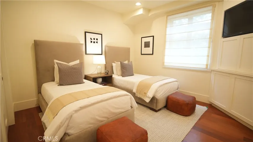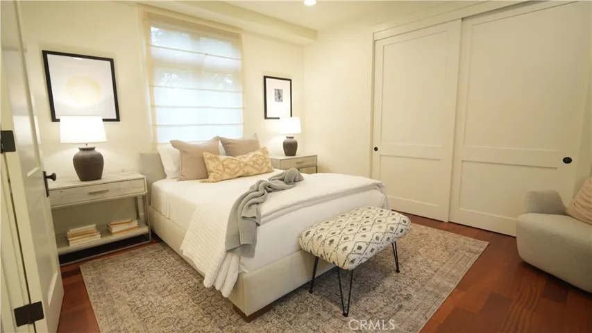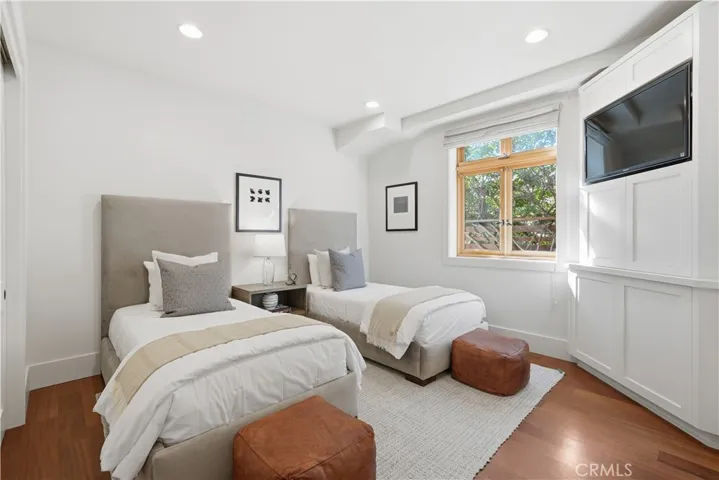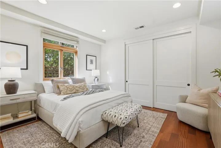 The luxurious primary suite is a true retreat, featuring a spa-like bathroom with a freestanding bathtub, a striking glass tile shower, and an expansive walk-in closet equipped with an innovative automatic rotating hanger system, along with an additional closet for enhanced convenience.