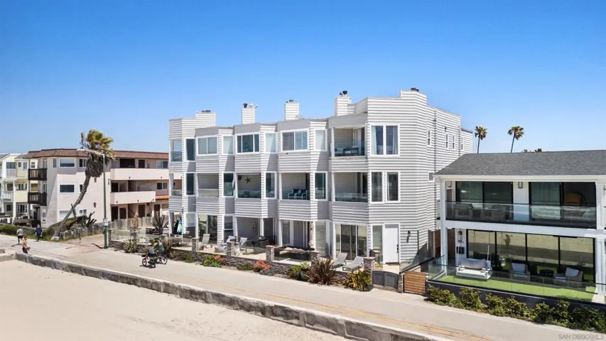 Welcome to your dream beach escape, a 2-bedroom, 2-bathroom oceanfront condo located directly on the Mission Beach boardwalk. This two-story residence offers unmatched views of the Pacific Ocean from nearly every room and provides direct access to the sand and surf just outside your door. Upstairs, the primary suite features a California king bed, wall-to-wall windows, and sliding glass doors that open to a private oceanfront balcony. The ensuite bathroom includes dual vanities, a walk-in glass shower with river rock flooring, and soothing coastal finishes. The second bedroom is equally comfortable, with a California king bed, smart TV, desk space, and an adjacent full bathroom with a combination tub/shower and dual sinks. The living area features a cozy fireplace and expansive windows that bring in natural light and fresh ocean air throughout the day. A TV is located in each room for added comfort and convenience. Please note, pets are not permitted in this home. The kitchen is complete with modern appliances, granite countertops, and a center island ideal for prepping meals. There is kitchen bar seating for four and a separate dining table. Additional amenities include in-unit washer and dryer, air conditioning, and a small designated parking space in front of the garage. Whether you’re here for work, rest, or play, every detail is designed to make your stay feel exceptional. Sleeping Accommodations (Maximum Occupancy 4): Bedroom 1 – 1 King bed Bedroom 2 – 1 King bed – There are a total of 2 bathrooms