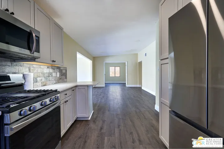 Totally remodeled interior from floor to ceiling! Single-story 3 bedroom, 2 bathroom with attached garage located in the sought-after Cove neighborhood, in the northern portion of the of the magical La Quinta desert community, right next door to La Quinta Community Park with recreational pool, playgrounds, tennis and pickleball courts, shopping and retail. Fresh, new construction that includes engineered wood flooring throughout, new appliances, new quartz counter tops, new cabinets, new flush-mount recessed lighting, new stone subway tile back splash, new dual-sink vanity, new subway and mosaic tile shower, and new interior and exterior paint. Separate inside laundry room. Central AC and heat. New large concrete patio off of back french doors. Mature citrus tree and drought tolerant landscaping.