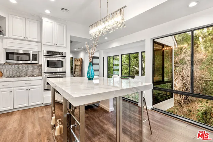 Tucked behind a privacy gate and up a private 200-foot driveway rests this charming Benedict Canyon hideaway, positioned amidst mature trees and lush vegetation. Live a lifestyle in divine harmony with nature and views of verdant greenery from every room. Inside, wide-plank floors lead from each space to the next as large picture windows and walls of glass welcome natural light within. A greenhouse breakfast nook is adjacent to the remodeled kitchen, with its beautiful center island, dazzling backsplash, stainless-steel appliances, bright white cabinetry, and on-trend fixtures and finishes. The formal living room is centered by a decorative fireplace and offers wraparound views of the grounds and the surrounding hillside environment. The primary suite is a serene refuge and has a bathroom with dual-sink vanity and separate shower and jetted tub as well as a walk-in closet. Other bedrooms provide a unique, comfortable treehouse feel reminiscent of summer camps and family vacations. There is also a remodeled guest house with kitchenette, side patio, and bathroom. Numerous outdoor amenities include grassy lawns, rolling hills, meandering cobblestone pathways, a built-in barbecue, pool, spa, lounging decks, water features, and plenty of spaces to relax and dine al-fresco. Welcome home! Also available for sale.