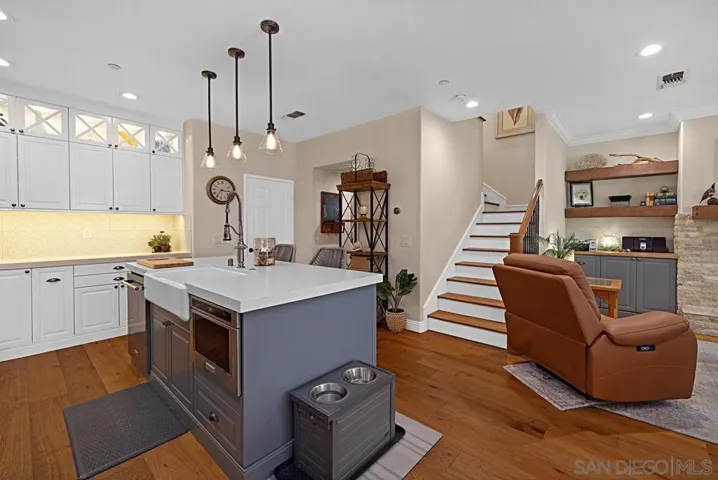 Experience the ultimate in luxury and convenience encompassing this extensively renovated, turnkey residence in the beautifully maintained, gated Bungalows at Escala community. This rarely available 3-bedroom, 2.5 open floorplan lives like a single-family home, offering privacy and serenity in a centrally located San Diego neighborhood just minutes from all San Diego has to offer. Enjoy gardening or relaxing in your private fully gated backyard with no homes behind you, surrounded by mature landscaping and peaceful panoramic hillside views. Interior highlights include a new kitchen with high end KitchenAid appliances, a built-in under counter microwave oven drawer, a large kitchen island, under cabinet lighting, lighted soft close cabinet drawers, and quartz countertops. A large walk-in pantry and a new full size stacked LG washer and dryer with built-in cabinets and a butcher block folding countertop create extra storage. Stunning wide plank, wire brushed French Oak flooring installed throughout the home with matching custom-built wood stairs and handrails. Warm yourself by the oversized fireplace flanked with a wood mantle, wood shelving and rustic split limestone facing. The spacious primary bedroom features a new bathroom with a large walk-in tiled shower, three shower heads, built-in bench seat, a free-standing soaking tub, and a concrete surface double sink vanity. Hand troweled walls and ceilings, and recessed lighting on dimmer switches throughout. 3rd bedroom currently showcased as a lighted walk-in closet, easily returned to 3rd bedroom use if desired.