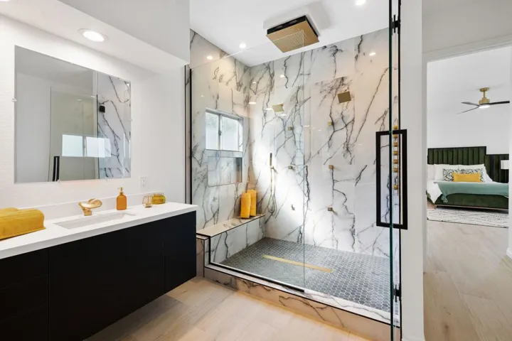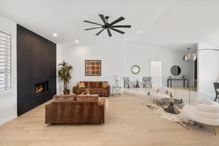 Back on market, no fault of seller. Welcome to this stunning completely move in ready 3-bedroom, 3.5-bath entertainer’s paradise located in the highly sought-after no HOA South Palm Desert neighborhood.Thoughtfully remodeled with attention to every detail, this home boasts an open floor plan perfect for both relaxation and entertaining, and it comes equipped with solar panels, offering energy efficiency and reduced utility costs.The chef’s dream kitchen is the centerpiece of the home, featuring custom cabinetry, brand new stainless steel appliances with bronze finishes, a large 6-burner stove, electric convection oven, double island with bar seating, and a custom microwave drawer. With three ovens in total, this kitchen is fully equipped for any culinary adventure. Direct access to the private, gated front courtyard makes indoor-outdoor entertaining seamless.The home boasts two spacious suites – a luxurious master and a junior suite along with a third bedroom- each featuring its own en suite bathroom with custom vanities and beautifully redone showers. The living room flows effortlessly into the large family room featuring a bar and powder room, creating ample space for all gatherings.Step outside to your desert oasis, where the backyard offers a serene space complete with desert landscaping, a putting green, covered patio, and plenty of room for lounging by the pool.Located just minutes from highly rated Washington Charter School, El Paseo shopping, Westfield Mall, Whole Foods, and more, this home truly has it all!