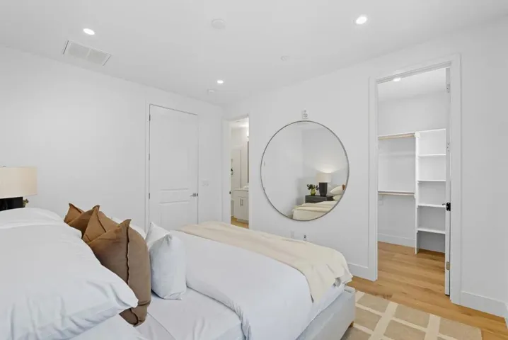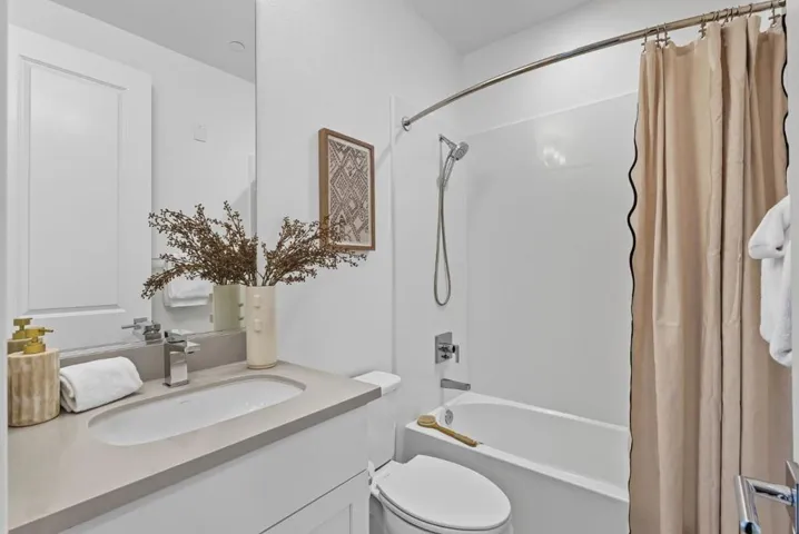 Built in 2022, this modern Mountain View townhome offers 3 bedrooms, 3 bathrooms, and 1,471 sq. ft. of thoughtfully designed living. Natural light fills the open-concept main level, where a sleek kitchen with quartz countertops, stainless steel appliances, and ample cabinet space flows seamlessly into the dining and living areas. Wide-plank engineered hardwood floors extend throughout the home, creating a sophisticated backdrop. The flexible floor plan includes a main floor bedroom with a full bath, ideal for guests or a private office. Upstairs, two bedrooms provide comfort and privacy, along with the convenience of indoor laundry. Designed for comfort and efficiency, the home features triple-pane windows, a north-facing orientation for added brightness and privacy with no direct neighbors on one side, and fully paid solar panels. Close to major tech campuses, top-rated schools, shopping, dining, and parks, this home captures the essence of Silicon Valley living.