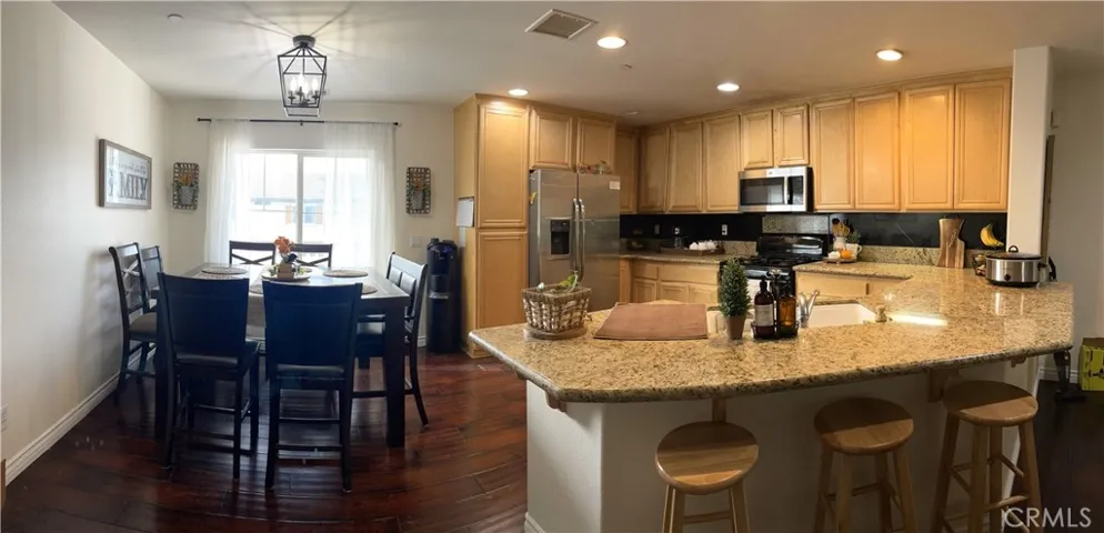 Tastefully upgraded 3 bedroom & 2 bathroom condo in the Gated Main Street Route 66 Community. This unit features open floor plan with 2 balconies – one off the living room and one off of the master bedroom. The kitchen features granite counters peninsula island bar sitting and stainless appliances. Laminated hardwood floors throughout the living area, carpet in the bedrooms and stairway. The primary bedroom features a walk-in closet with a shower, dual vanity sinks, and private toilet room. Secondary bath with a tub/shower in the hallway with in unit laundry closet. Attached 2-car garage on the ground floor with direct access to the unit. The Main Street Route 66 gated community is meticulously maintained and features a pool, spa, BBQ and children’s play area. Fantastic location close to all major shopping and freeways and is nestled close to the foothills, giving you a lovely view of the snow topped mountains. Water is covered by the HOA.