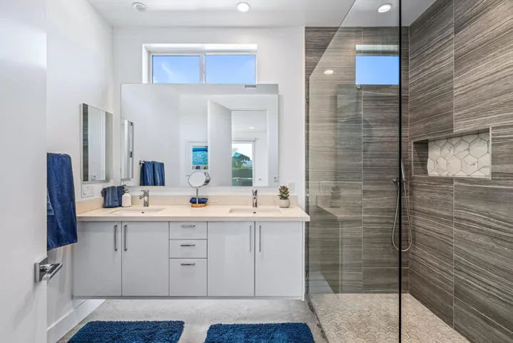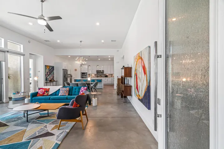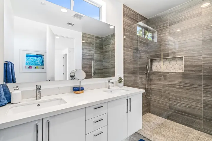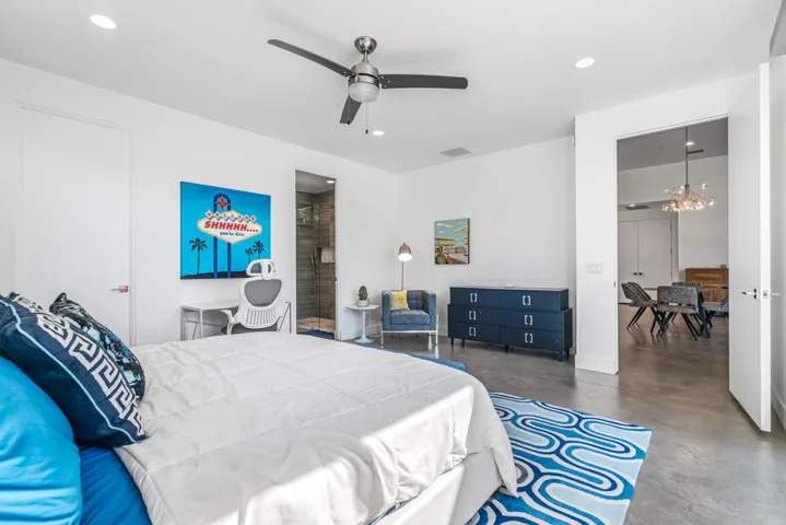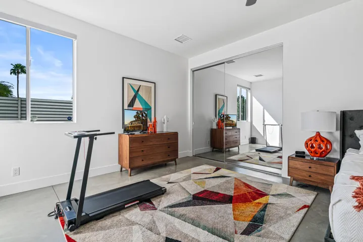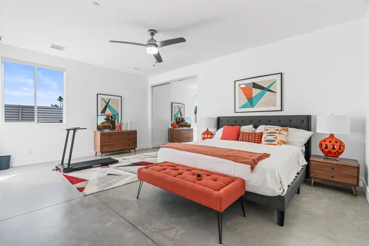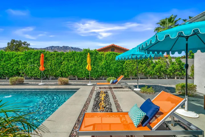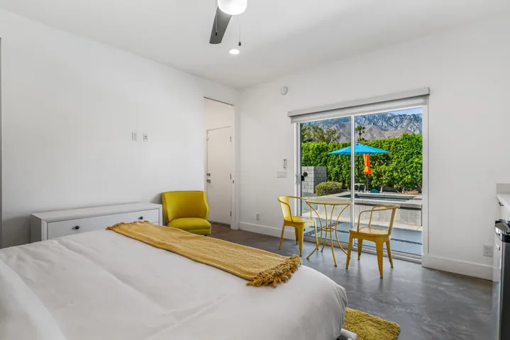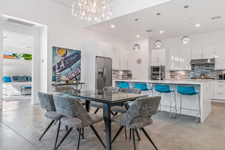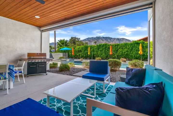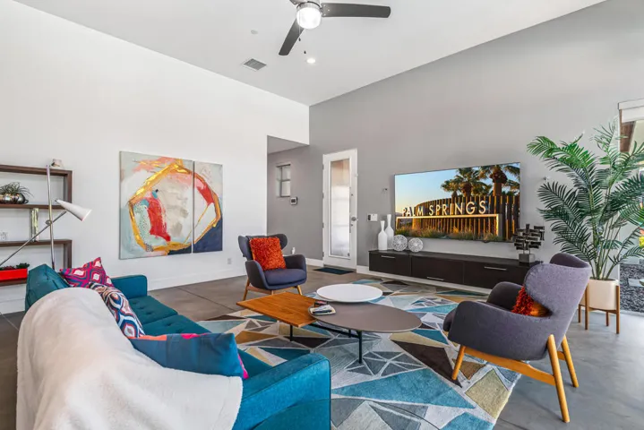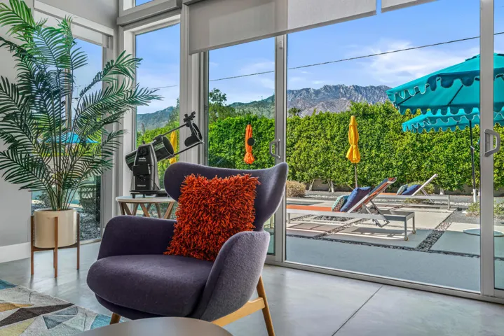 Welcome to 2077 E. Nicola, a stunning modern home, perfectly located in the heart of Palm Springs. Designed with clean lines, soaring ceilings and light filled living spaces, this residence offers both style and functionality. A 4 bedroom home includes a versatile casita with private washer/dryer hookups, ideal for guests or as a rentable unit for extra income. The seamless indoor-outdoor living is enhanced by walls of glass that open out to the pool side retreat and a covered patio with rich tongue and groove wood detail, creating an inviting lounge area overlooking the sparkling pool, spa and sweeping mountain views. Set on a large, low maintenance lot with block wall for privacy, private courtyard entry , Brilliant auto controls for turning on lights, pool, etc, this property is perfect for entertaining or simply relaxing in your desert oasis. The home’s sleek concrete floors, automated smart features for lighting and pool, and open-concept design add to its modern appeal. Whether your seeking a full time residence, a luxurious second home, or an income producing property, this Palm Springs gem delivers it all-style, comfort and endless potential.