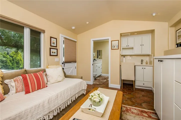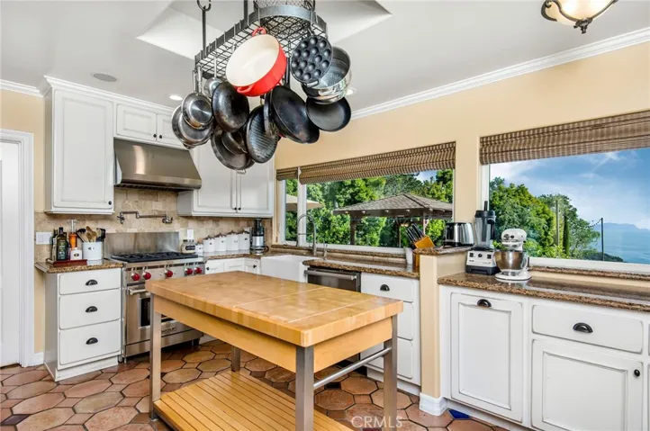 Main house has 3 bedrooms 2 baths, kitchen with Subzero 48 Pro refrigerator, Wolf stove, middle island…Attached, but with separate entry is a Studio with its own bathroom. Unbelievable views grace all rooms, including a separate Guest house with its own bathroom. Outdoor living in this property is unparalleled, with numerous sitting areas, a built in BBQ with full outdoor kitchen, fireplace – all open to panoramic ocean views !