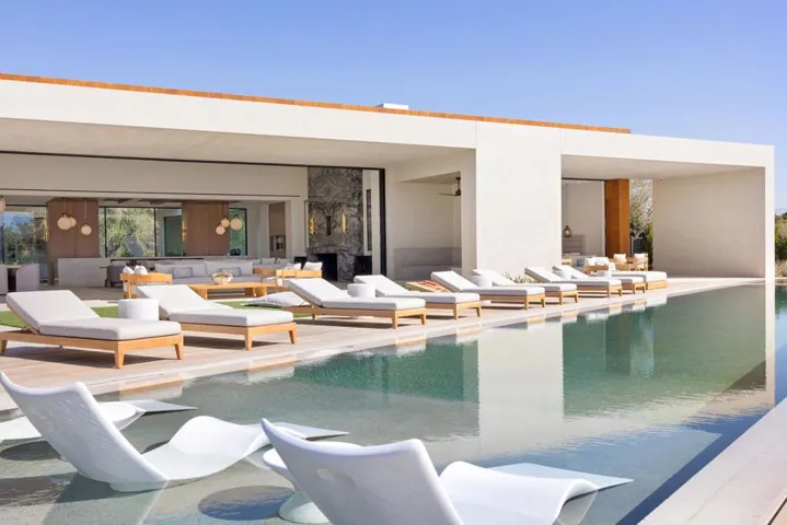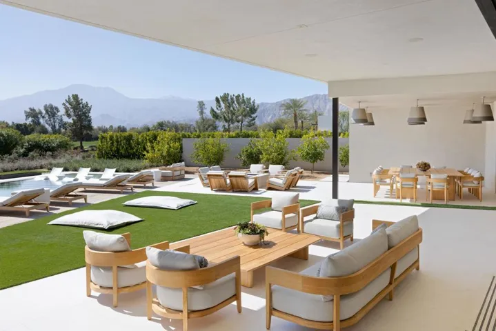 Experience the ultimate in luxury living at this stunning estate in the prestigious Madison Club. This exquisite property offers 7 bedrooms, 7.5 baths, and 10,046 square feet of living space, with panoramic views of the Santa Rosa Mountains and the 4th hole of the renowned Tom Fazio-designed golf course. This home is a masterpiece of design and craftsmanship, featuring top-of-the line finishes and amenities, such as a golf-simulator room, an office/home gym, art hallways, and a well-appointed bar and wine cellar. Enjoy breathtaking panoramic views by the cozy fireplace in the spacious great room or unwind in the opulent primary bedroom suite, complete with fireplace, sauna and steam room. The gourmet kitchen is a chef’s dream, equipped with a prep kitchen and a large pantry. The floor to ceiling glass doors pocket away to create a seamless transition from indoor to outdoor living areas, where you can enjoy the outdoor fire features, the infinity edge pool, the spa, and the built-in barbecue. The separate living upstairs offers privacy and comfort, with two bedrooms, two baths, a living area, a kitchen, and an outdoor lounge area with a fireplace and endless 360-degree views of the desert. This home is a rare opportunity to own a piece of paradise in one of the most exclusive communities in the desert. Don’t miss this chance to live your dream at the Madison Club.
