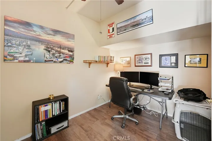This 4-bedroom plus office, 3-bath home offers 2,620 sq. ft. of thoughtfully designed living space. Step through the front courtyard and be welcomed by soaring ceilings and an open floorplan featuring formal living and dining areas. The spacious family room with fireplace flows seamlessly into the remodeled kitchen, creating a bright, connected space perfect for gatherings. The kitchen boasts shaker-style cabinets, quartz countertops, and a large center island with seating for six. Modern vinyl flooring runs throughout the home. The downstairs office and full bath provide a convenient space for guests or working from home.