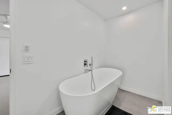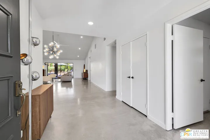 This home presents a rare opportunity to own a piece of architectural history, enhanced with modern comforts and eco-conscious upgrades. This stunning free-standing home, designed by iconic mid-century modern architect Donald Wexler, is in the private, gated community of Rancho Estates. The interior is thoughtfully updated and features sleek polished cement flooring, energy-efficient LED lighting, and a renovated kitchen with all new appliances. The focal point of the living room is a floor to ceiling mid-century modern inspired fireplace. Bathrooms have been stylishly upgraded with new countertops, sinks, faucets, and toilets, while the luxurious primary bathroom includes a new shower and a free-standing soaking tub. Custom closets enhance a large walk-in closet in the primary bedroom. Comfort and sustainability meet with a dual-zoned HVAC system, a 14-panel owned solar system, and an EV charging station. Situated on one of the largest lots in the community (6,098 sq ft), the beautifully landscaped backyard offers a private oasis with a pebble-tech salt-water pool and spa, mature citrus trees, and an outdoor kitchen, perfect for entertaining or unwinding in style. For a complete list of improvements, see documents. Community amenities include a swimming pool, tennis courts, pavilion and beautifully maintained common areas. HOA includes internet and cable.