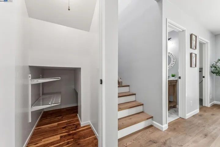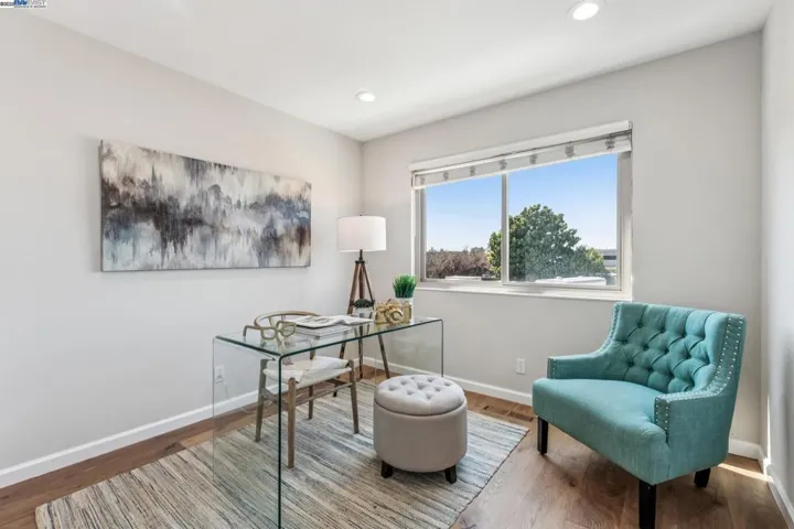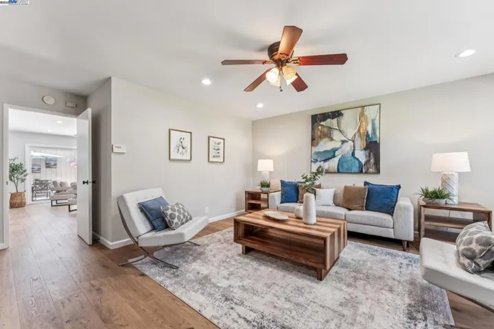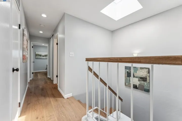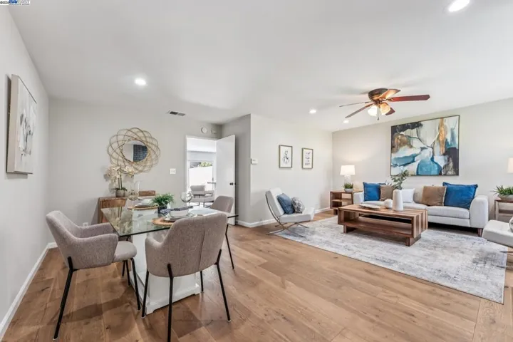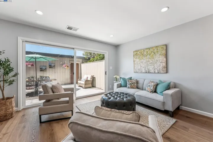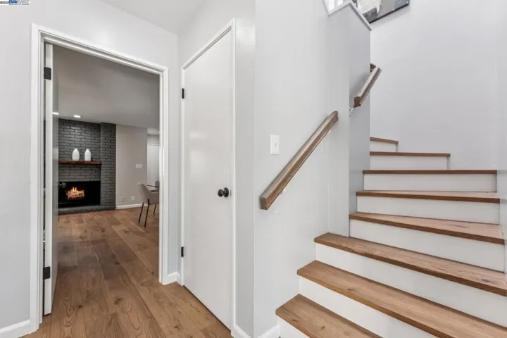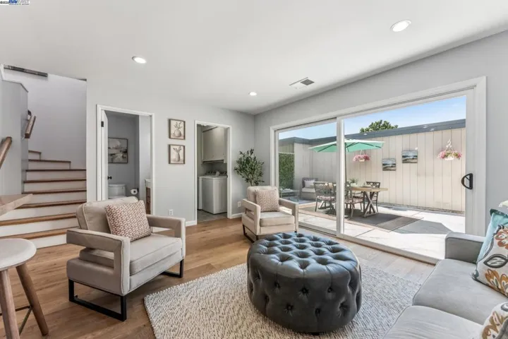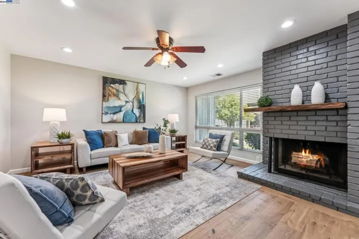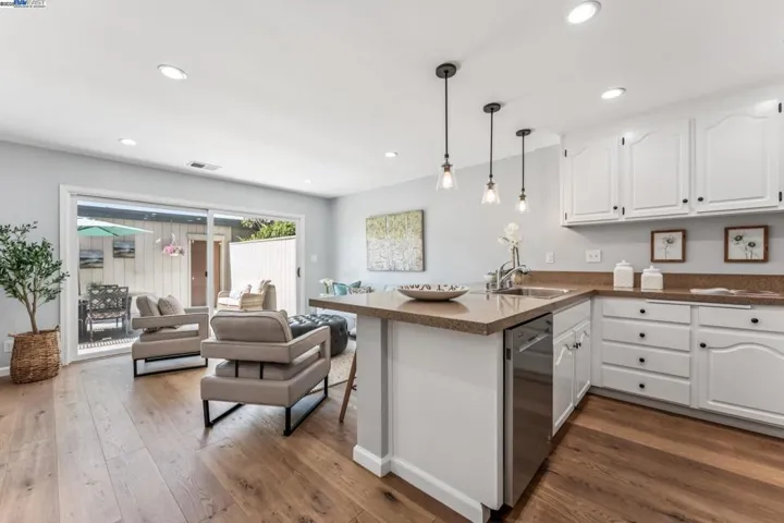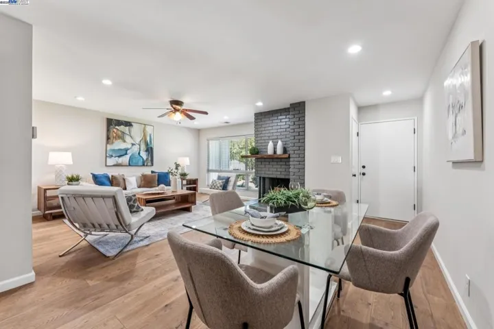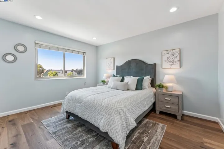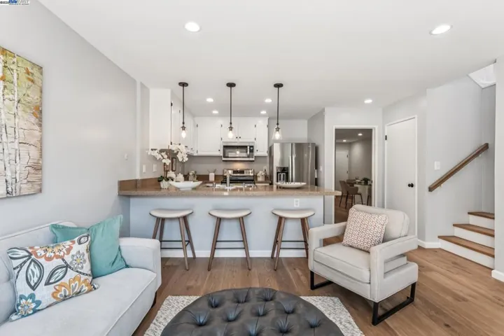 Beautifully updated 4BR/2.5BA townhome in Alameda’s Bay Farm community. This spacious home features engineered hardwood floors throughout, recessed lighting, dual-paned windows, and fresh interior paint. The open living and dining areas are anchored by a custom redwood fireplace mantel, while the eat-in kitchen offers pendant lighting, pantry, counter seating, and newer appliances. A private stamped-concrete patio extends the living space outdoors. Upstairs, the primary suite boasts a remodeled bath with custom tile, waterfall shower, dual-sink vanity, and farmhouse paneling. The guest bath was also fully updated with a soaking tub, new tile, vanity, and fixtures. A remodeled half bath and laundry room with washer/dryer are conveniently located downstairs. Additional highlights include a 2-car garage, new patio screen, and community pool/clubhouse just steps away. Situated across from a greenbelt and close to top-rated schools, parks, shoreline trails, shopping, and the SF ferry — this move-in ready home is a must-see!