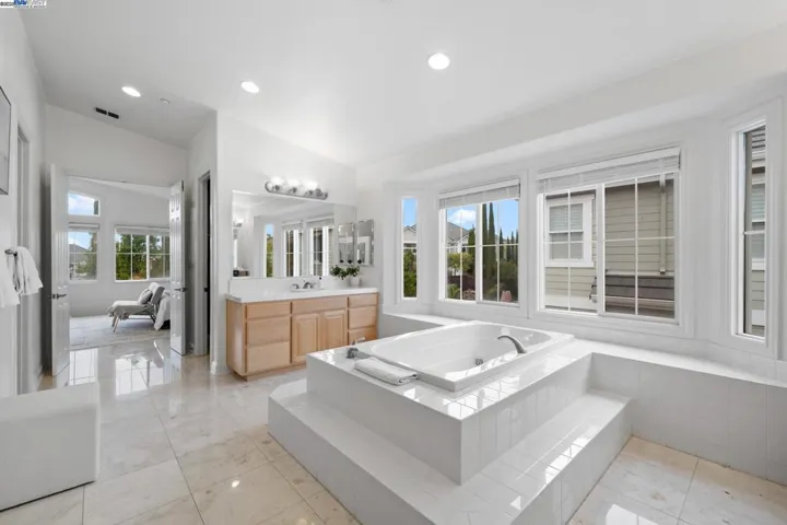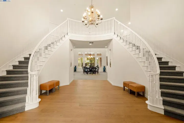 Rare Atherton Floor Plan in the exclusive gated Pinnacles community at Dublin Ranch Golf Course, offers a luxurious 5,585sqft home on a 10,800sqft lot. Ideal home for large families and entertaining guests. Built by Toll Brothers, this magnificent residence boasts five spacious bedrooms, each with its own full en-suite bathroom and a private library/ home office. The dramatic two-story foyer features an elegant circular dual staircase, while the formal dining and living room area is bathed in light from soaring two-story ceilings. Only model with back stairs which leads to an open concept floor plan with kitchen and family room looking out to a private covered patio and backyard. The kitchen is a culinary delight for home cooks with a large island upgraded granite counters, double ovens, gas cook range. Private master bedroom with a fireplace, huge master bathroom suite complete with two vanities, a jetted tub, a walk-in shower, and his and her spacious walk-in closet. Located near the SF Premium outlets, dining, top-rated schools, Bart, and easy access to the freeway. HOA amenities includes large community pool and tennis courts.