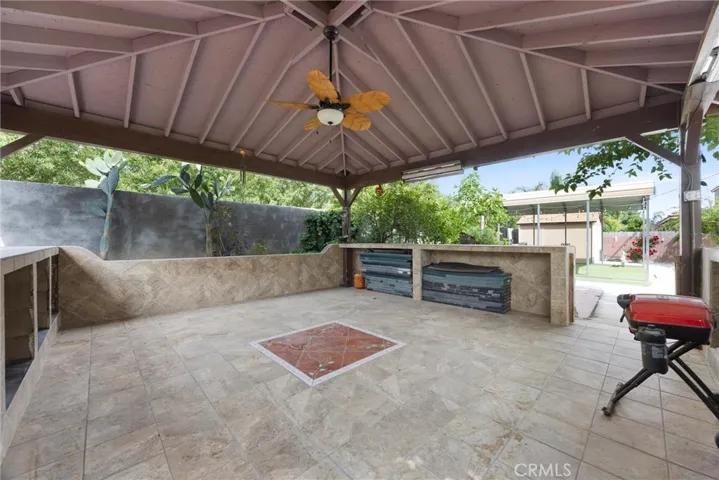 Beautifully upgraded 2-story home with 6 spacious bedrooms and 2.5 baths. The downstairs features tile flooring, cathedral ceilings, ceiling fans throughout. The open concept kitchen is fully remodeled with stainless steel appliances, upgraded countertops, a decorative backsplash, and a walk-in pantry. The expansive backyard is perfect for entertaining with a built-in BBQ, outdoor kitchen, covered patio, and a carport for added shade. There is also a storage unit for additional lawn equipment and or tools. A cinder block wall surrounds the backyard for added privacy. The gated RV access and iron doors on both sides of the home add convenience and security. The enclosed patio room is ideal for a game room, gym, or extra living space. Additional features include a dog run, spacious 3-car garage, 9 surveillance cameras, and energy-saving solar panels that the buyer can assume.