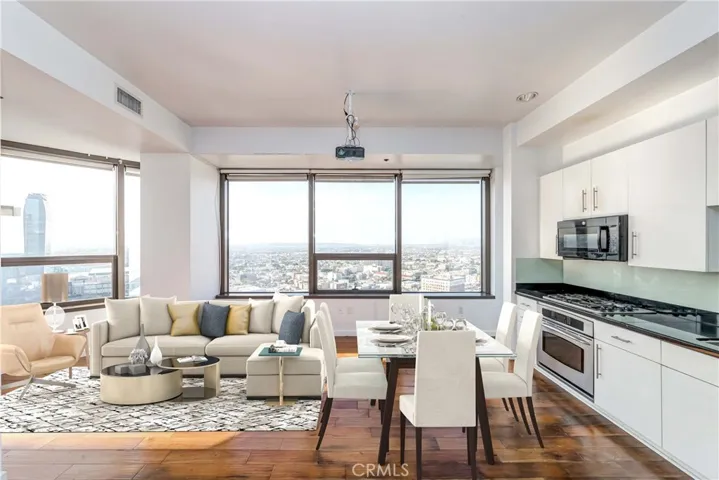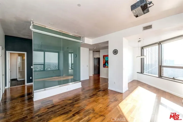 A rare corner loft suite on the 22nd floor offering sweeping southwest facing panoramic views of the Downtown LA skyline, LA Live, the Westside, and the resort style sky deck with pool. The flexible den functions perfectly as a breakfast nook or home office. The modern European style kitchen features upgraded appliances, granite countertops, and elegant cabinetry, complemented by wood floors throughout. A glass partition subtly separates the living and sleeping areas while maintaining an open airy loft feel. Additional highlights include an in unit LG washer and dryer, a spacious bathroom with storage, and two side by side parking spaces. Residents enjoy resort quality amenities, including a 17th floor sky deck with a heated infinity pool, spa, cabanas, lounge beds, wet bar, BBQ grills, and a fire pit lounge area. The building also offers a fully equipped fitness center, media and screening room, business center, and 24 hour concierge, security, and on site management. Located just moments from LA Live, Crypto.com Arena, the Convention Center, public transit, restaurants, and major freeways, this corner unit combines exceptional design, bright and open living, and the very best of downtown lifestyle.