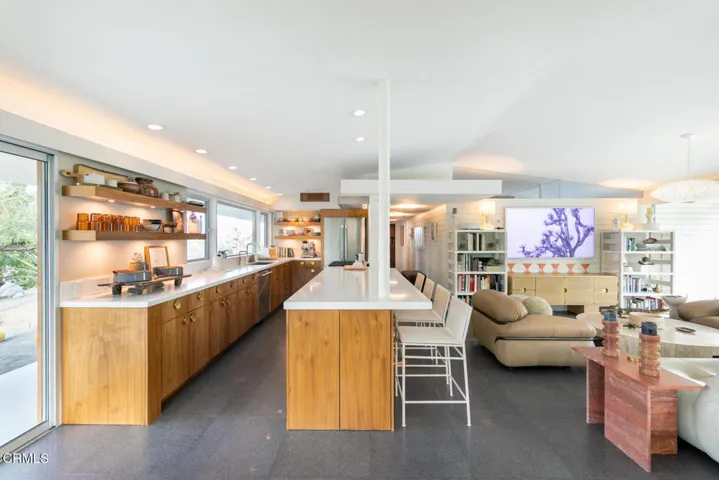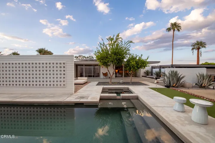A true collector’s item in the world of desert modernism, 73271 Buckboard Trail–known as the Paulette Herbert Johnson House–is a 1958 mid-century masterpiece by celebrated architect Walter S. White. Rarely does a home of this significance come to market–an exquisitely maintained and restored example of Palm Desert’s architectural history, blending timeless design with resort-style living.Step through a pebble-stone entry into an open, light-filled floor plan where floor-to-ceiling glass walls, terrazzo floors, original wood paneling, and signature masonry walls create a seamless indoor/outdoor flow surrounding the living and dining areas. The custom wood panel kitchen cabinetry pays homage to its mid-century roots, while two beautifully appointed bedrooms feature cork-lined closets and bathrooms with authentic period tile and lighting. Natural light pours through every corner, framing breathtaking views of the surrounding gardens, mountains and desert skyline.The grounds are a modernist playground: a Parker-style pebble bottom pool and spa, outdoor kitchen with barbecue and pizza oven, bocce court, putting green, lounge gazebo, firepits galore, and room for an ADU–all set against panoramic desert vistas. A spacious two-car garage plus additional parking for up to six vehicles completes the estate.Located in the historic Silver Spur Ranch enclave, this home is just minutes from El Paseo’s dining and shopping, the Living Desert Zoo, and Palm Desert’s country clubs. More than a residence, it is an architectural icon–the Paulette Herbert Johnson House by Walter S. White–restored to its full glory and offered as a rare opportunity to own a celebrated piece of California modernism.