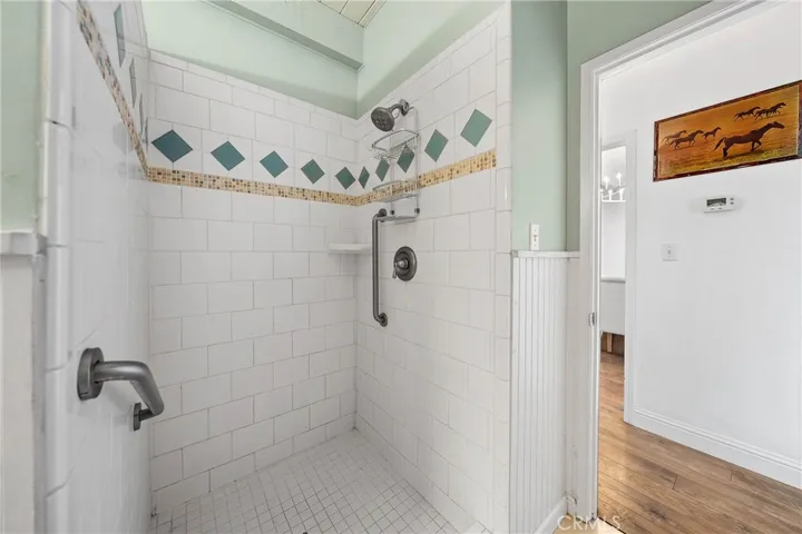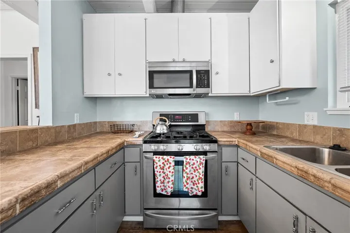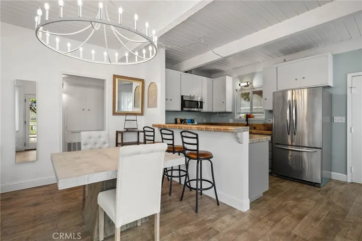 This lakeside residence has been recently upgraded to reflect modern styling. Key features include new windows, French doors, and continuous laminate flooring throughout the main living areas. The light-filled great room boasts exposed beams and doors that open directly onto a large front deck overlooking the lake. The modern kitchen is equipped with tile countertops, bar counter seating, and stainless steel appliances, including a propane range, microwave hood, and refrigerator. The integrated dining room, enhanced by a modern chandelier, is situated off the French doors leading to the wrap-around style deck—an ideal space for entertaining and barbecues. The home offers two naturally lit bedrooms, both featuring slider doors that provide access to the wrap-around deck. The updated bathroom includes a walk-in tiled shower, wainscoting, and a single furniture-style vanity.