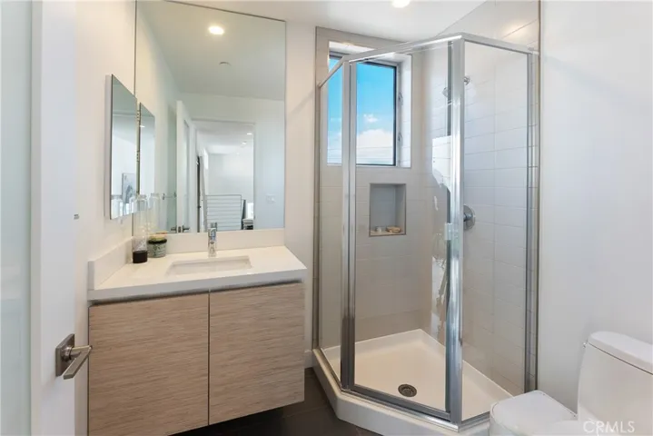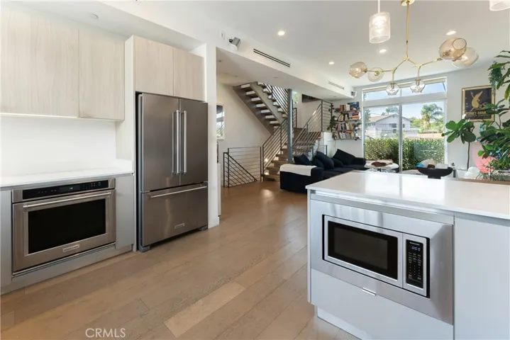 The gourmet kitchen showcases custom millwork, stainless steel appliances, and a spacious island perfect for entertaining. Two generously sized bedrooms include a primary suite with spa-inspired bath and walk-in closet. A versatile top-floor bonus room with a full bath and expansive roof deck creates the perfect third bedroom, office, or den, complete with views of Downtown and the Hollywood Sign. The home is finished with a private entry and two-car garage, offering both convenience and privacy.