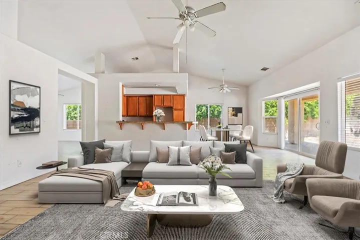 This inviting 1,837 sq. ft. home, built in 2005, offers comfortable living with beautiful desert mountain views. The open floor plan features attractive plank-look tile flooring in the main living areas and warm wood-look laminate in the bedrooms, providing easy, low-maintenance style throughout. High volume ceilings add a spacious feel, while a cozy fireplace creates a welcoming focal point.