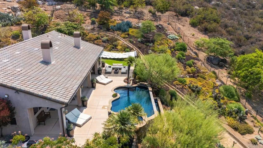Occupying one of the highest ridge tops in the prestigious Talon’s Reach/Blossom Valley community, this 6-Acre, luxury estate offers unparalleled privacy, seclusion, and connection with nature. Situated at the end of Espinoza Road, a serene, rural-meets-refined corridor featuring gracious estates set on expansive acreage— this amazing property delivers both privacy and spectacular views. Set behind its own private gate at the end of a sweeping cobbled driveway, this absolutely gorgeous custom-built single-level home includes a pre-graded 3000 square foot building pad, perfect for an ADU, RV garage or guest house. Complete with a sizable citrus and avocado grove, this property offers plenty of space for the avid gardener. Designed with modern elegance and natural beauty in mind, this unique estate blends sleek finishes, panoramic mountain-to-city views, and oasis-like serenity into one extraordinary property. The open layout is filled with natural light, with expansive windows that capture sweeping vistas from nearly every room—bringing the outdoors in. Multiple living areas offer space for both grand entertaining and intimate gatherings, while an enormous chef’s kitchen anchors the home with high-end finishes, generous counter space, and seamless flow for culinary creativity. Designer upgrades and meticulous craftsmanship are found throughout, showcasing an attention to detail that defines luxury living. Step outside to an entertainer’s paradise: a zero-edge pool that seems to spill into the horizon, with golden sunsets and starry skies as your nightly backdrop. Just imagine soaking in your custom spa nestled among palo verde trees on a moon-lit night. Or, dining under the stars beside the outdoor fireplace as you take in the spectacular mountain and city views. This rare estate captures the essence of Blossom Valley—peaceful, private, and perfectly located. Whether you’re seeking a luxury residence, multi-generational living opportunity, or a nature-inspired sanctuary, this home delivers it all. With modern sophistication, natural beauty, and room to expand, it stands out as one of the most desirable properties in East County!