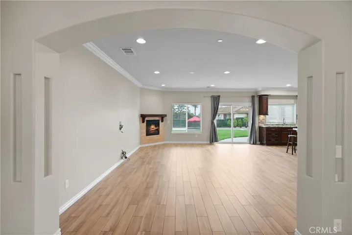 At the heart of the home, the spacious kitchen is designed for connection and convenience. A large center island, extended counter space, gas range, and abundant cabinetry make it both functional and inviting. The kitchen flows seamlessly into the family room and opens directly to the backyard—ideal for everyday living and entertaining.