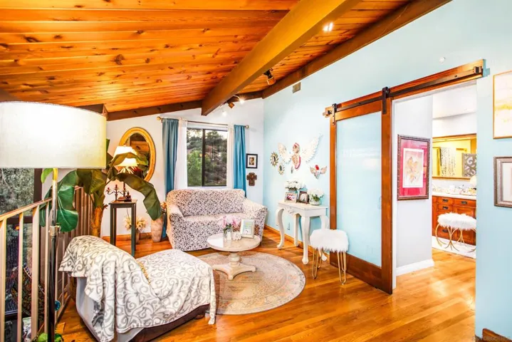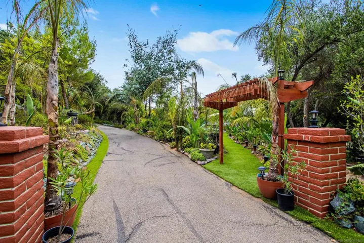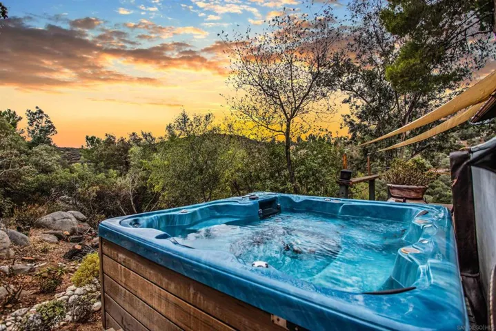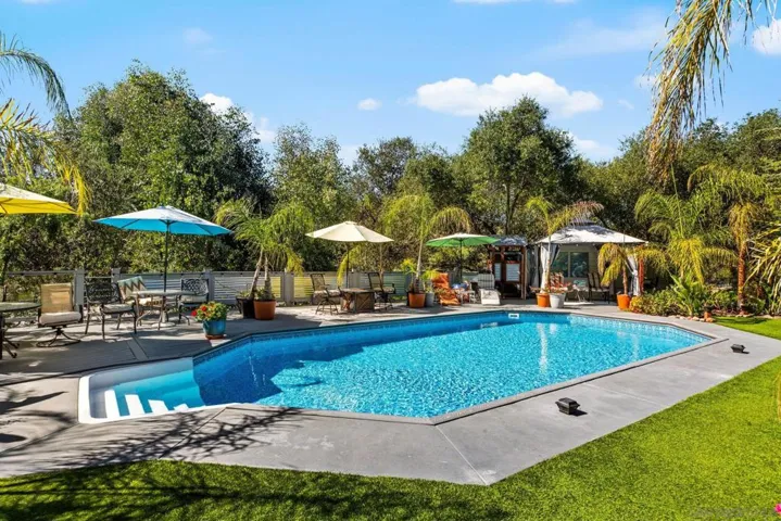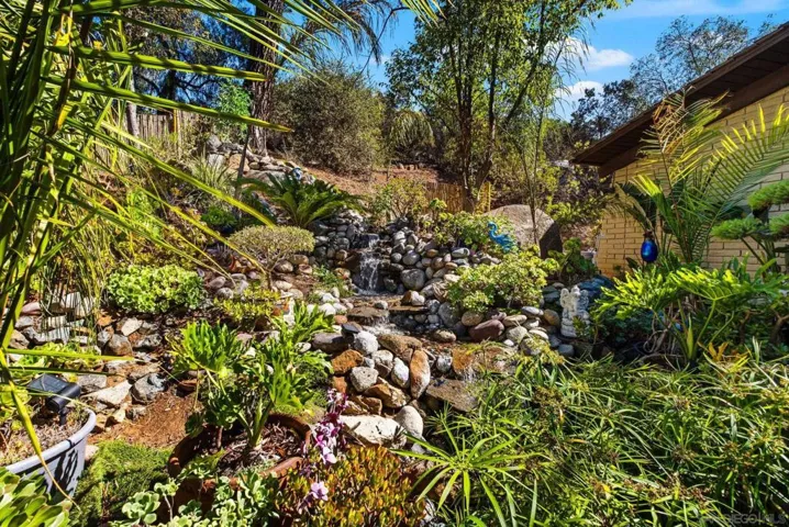 It’s as unique as you are—your own private, tropical retreat nestled in the foothills with stunning views of hawks circling the treetops. It’s calm, quiet, and tucked away from it all in Palo Verde Ranch—yet you’re just minutes from stores and restaurants. This jaw-dropping custom home is a rare, one-of-a-kind find. An artful 25 foot high waterfall cascades down as you approach the front door and flows under a bridge—each time you walk across it, you slow down and breathe a little deeper. The spectacular soaring glass foyer welcomes you in. Floor to ceiling windows flood the sprawling living/dining area with natural light, and the warm honey-toned high vaulted ceilings give a golden glow. A dramatic 20 foot high stacked stone fireplace anchors the space. The updated open-concept kitchen and den—with its stacked stone wall, fireplace, and granite hearth exude comfort and ease. Real hardwood floors, custom details, and thoughtful design give this home its uncommon blend of elegance, warmth, and character. All three bedrooms boast the rich, honey-colored vaulted wood ceilings. The serene primary has a spacious walk in closet and a high deck with views. There are two and a half bathrooms, plus a bonus space—ideal for a home office, guest area, or creative studio. All rooms except one connect to the outdoors through large sliders, and each of four decks offers a different view of the trees, boulders, and mountains. A breezy 27×27 covered deck adds even more outdoor living space for dining, entertaining, and spectacular sunsets. You also get owned solar, zoned AC plus a bedroom unit, a two-car garage with half bath and laundry, two carports, a 16×12 detached workshop, and ample parking space. The sparkling salt water pool with its giant Trex deck, gazebo, and carefree turf is perfect for relaxing. With 107 queen palms waving gracefully in the near-constant gentle breeze, 40 giant bird of paradise, and multi-colored flowers, visitors ask if this is a resort. The landscaping conserves water, doesn’t require mowing, blends with nature, and is lit with solar lights. Massage your worries and aches away in the chlorine-free 30-jet hot tub, visited by hummingbirds, owls, and doves. Equestrians and hikers appreciate the miles of trails right out the door. The barn can be used for horses or storage. Walk one block to a gorgeous lake, tennis/pickleball courts, a horse arena, and picnic pavilion set amongst picturesque ancient oaks, giant boulders, and trails with views of the Cuyamaca Mountains beyond. As part of the Palo Verde Ranch community, you also enjoy a clubhouse, gym, another park with a larger lake, sand beach, and lush lawn, a boat dock (electric boats only,) fishing, huge picnic pavilion, fun events, and more. This kind of property rarely comes along—peaceful, private, and unique character, all in a well-established, friendly community with top-notch amenities yet unbelievably low dues. If you’ve been looking for a home that feels like being on year-round holiday, this might be the one.