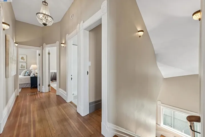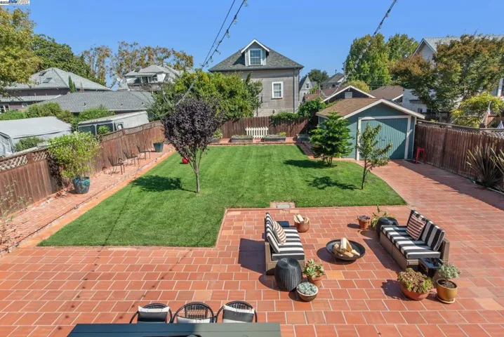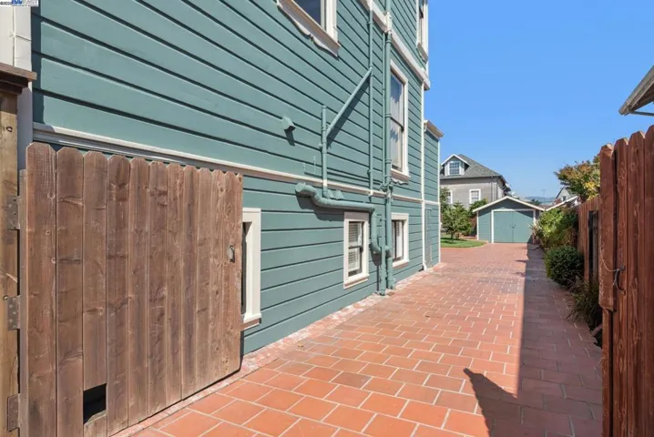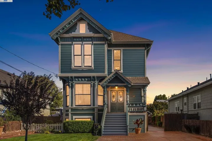 Enjoy the beauty of this majestic 4-bedroom, Alameda Queen Anne in a park-like setting. This fresh, 3000 sq. ft. light-filled home, sits on a large 7,500 sq. ft. lot and has a valuable 3-bedroom and 1-bath attached unit with a private courtyard entrance. Surrounded by lush lawns and classic terra cotta tile, it has 5 off street parking spaces and a long driveway to the rear garage with space for RV parking and an accessible full-bath The main home retains many original features with impressive soaring ceilings, pocket doors, gingerbread, and more. It features a welcoming formal entry and living room, a sought-after family room, a dining room off the kitchen, and a convenient half-bath. The modern kitchen echoes the architecture of the original home and is designed to be multi-purpose. It is equipped with five workstations, a walk-in pantry, and a laundry room. Amenities include a 6-burner Thermador gas cooktop with a pot filler, built-in oven, dishwasher, large capacity refrigerator, and a center island with an under-counter refrigerator. Picture windows offer an expansive view of the backyard. The second floor boasts 4 bedrooms and a delightful bathroom with a walk-in shower and a claw foot soaking tub. Additionally, there is approx. 660 sq. ft. of useful attic space.