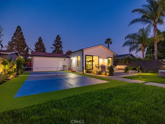 Evenings on Meyer Place are designed to impress. The private backyard retreat includes an exclusive pickleball-ready sport court—rare to find in this area. Professionally designed landscaping with accent lighting frames the modern architecture, while a beautifully lit citrus tree centerpiece creates a warm, inviting ambiance for gatherings. Indoors, a sleek fireplace wall and wide-opening glass doors seamlessly connect the living space to the outdoors.