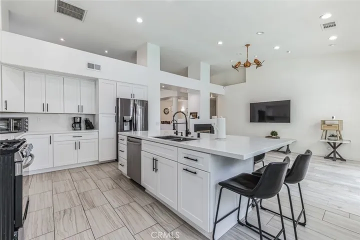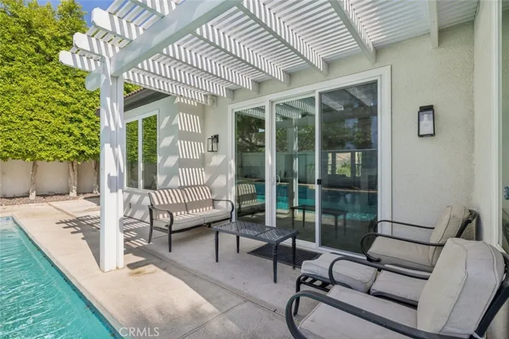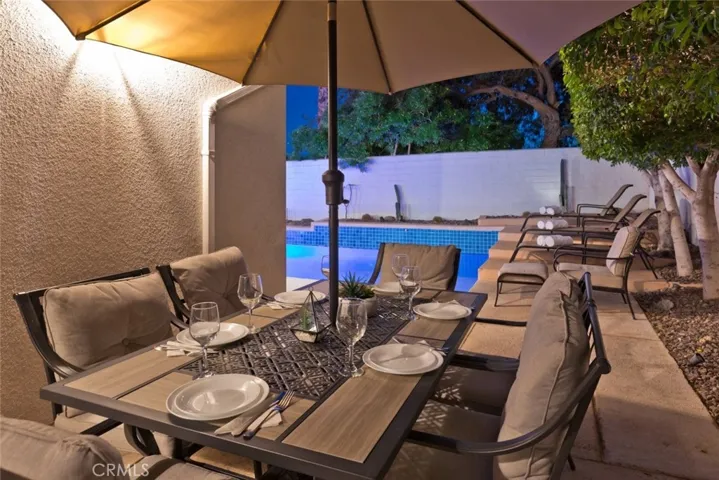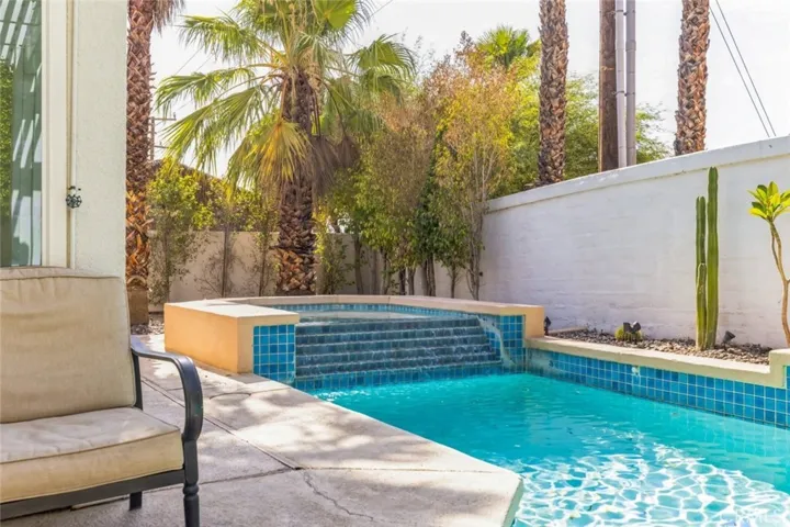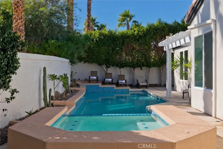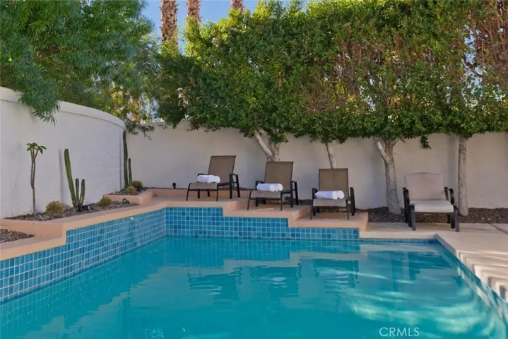 Outside, your private oasis is enclosed by privacy walls and enhanced with palm trees. The backyard is designed for relaxation and entertainment, featuring a sparkling pool, spa, outdoor barbecue area, and plenty of space to embrace the desert lifestyle.
