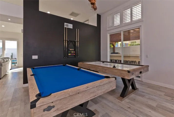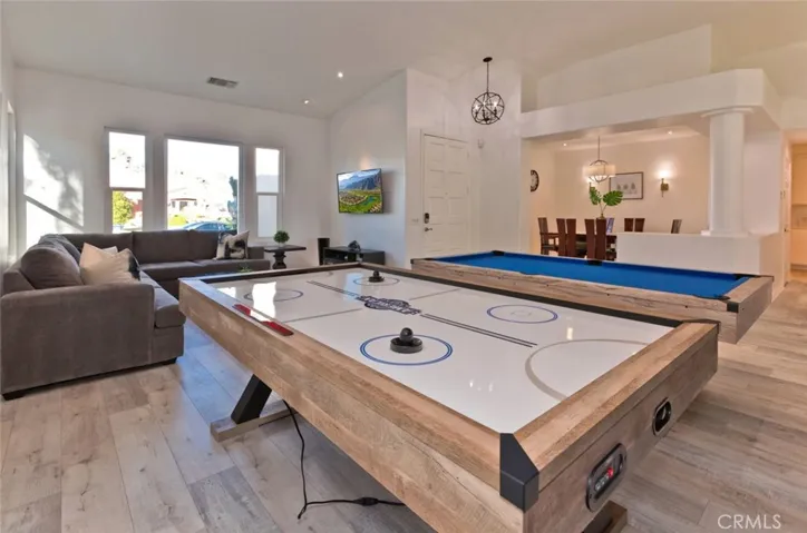 Upon entering, you are welcomed by a bright and open floor plan that includes a large living room with a cozy fireplace, an ideal spot for relaxing after a long day. Adjacent to the living room, the chefs kitchen offers an expansive island and contemporary finishes that inspire culinary creations. A formal dining room provides the perfect setting for hosting dinners and gatherings. The bright and airy family room, combined with a game area featuring a full size pool table and air hockey table, adds an extra layer of entertainment and enjoyment.