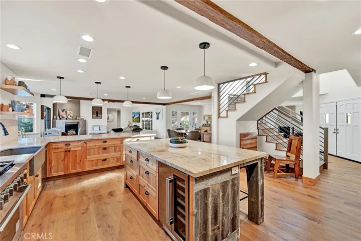 Welcome home to this stunning Mediterranean-inspired estate, set amidst the breathtaking views of Temecula Wine Country. Nestled on 8.63 peaceful acres of rolling land, this property offers the perfect balance of tranquility and luxury. The main home spans a generous 3,579 square feet and has recently undergone an extensive, high-end remodel. It features a beautifully appointed main-level primary suite, a junior suite, a guest bathroom, and a separate laundry room with ample storage. Upstairs, you’ll find an additional suite with two bedrooms, each with its own closet, and a shared full bathroom. The heart of the home is the chef’s kitchen, complete with top-of-the-line appliances, stunning “Knotty Alderwood” cabinetry, sleek granite countertops, and a cozy breakfast nook. The great room boasts a stately Venetian plaster-style fireplace, while the formal dining area offers the perfect setting for dinner parties. Step into the living room with a second fireplace, adding elegance to the living spaces. Throughout the home, you’ll enjoy beautiful engineered hardwood flooring, complemented by gorgeous tile and stone accents in the bathrooms. Multiple patios, including an expansive covered patio system, provide plenty of space for outdoor living. The outdoor cabana-style room with a mounted TV is perfect for entertaining, while the uncovered firepit patio overlooks your sparkling pool and spa—ideal for relaxing and unwinding. For extra versatility, an attached bonus room near the covered carport offers a great space for additional sleeping quarters, a gym, or a flexible room to suit your needs. The detached, two-story, 6-car garage is a true standout, featuring roll-up doors, a bonus/office space with a beautiful cabinet and sink, and an additional upstairs studio. The amazing backyard has panoramic views, multiple patios, planter boxes and pots around the backyard, along with a pickleball area and putting green. Additionally, there is a spacious chicken and small animal coop, plus 2 more small animal stalls on the lower level. With its stunning outdoor spaces, captivating views, and quality upgrades throughout, this property offers everything you could want in a home. There’s truly no place like it!
