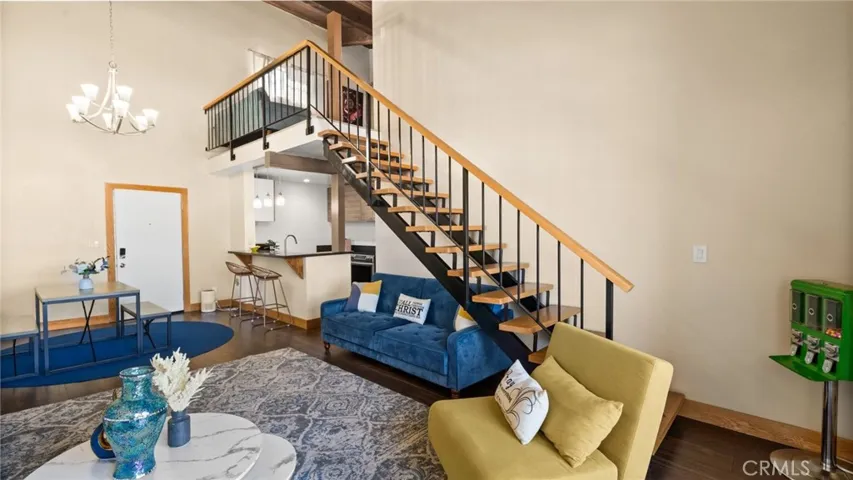 BACK ON THE MARKET!! This beautiful end unit condo welcomes you with 30 foot cathedral beamed ceilings, hardwood floors and porcelain tile throughout the first level. The galley kitchen boasts quartz countertops, stainless steel appliances and breakfast bar seating. Enjoy a balcony off the first floor, complete with storage. The primary bathroom includes a walk-in shower with bench seating, while the loft bathroom has a tub/shower combination. Amenities include 2 assigned parking spaces, guest parking, plentiful street parking, swimming pool, spa/hot tub, sauna, tennis court(s), recreation room, laundry facilities on each floor, and convenient trash chutes. The building offers secure entry and security cameras throughout. Conveniently located near LAX airport, downtown L.A., SoFi Stadium, and Intuit Dome.