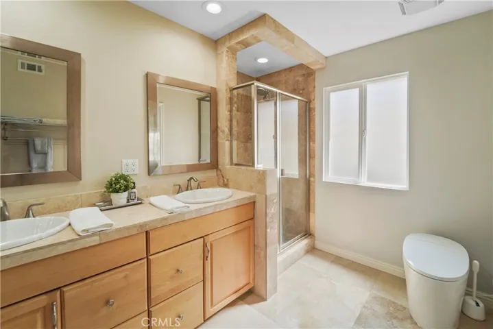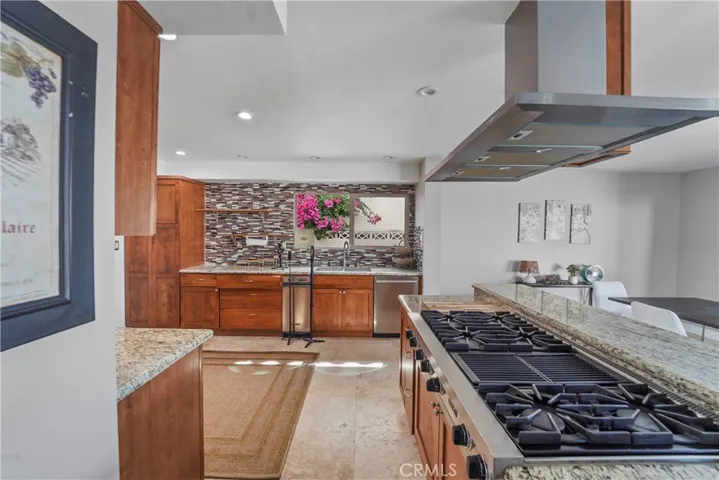 The main level offers a bright and spacious living room with vaulted ceilings, designer chandeliers, elegant travertine flooring, a sleek modern fireplace, and two large sliding glass doors that fill the home with natural light while showcasing stunning water views. The gourmet kitchen is appointed with a Viking cooktop, granite countertops, stainless steel appliances, and water views—perfect for both cooking and entertaining. A convenient half bath completes the downstairs layout.