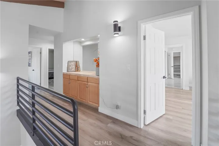 Upstairs, a contemporary metal staircase leads to three bedrooms with waterproof vinyl plank flooring. The primary suite boasts a private balcony, spa-like bathroom with soaking tub, separate shower, and abundant natural light. Down the hall, two additional bedrooms share a remodeled bathroom, with one bedroom offering its own private balcony.