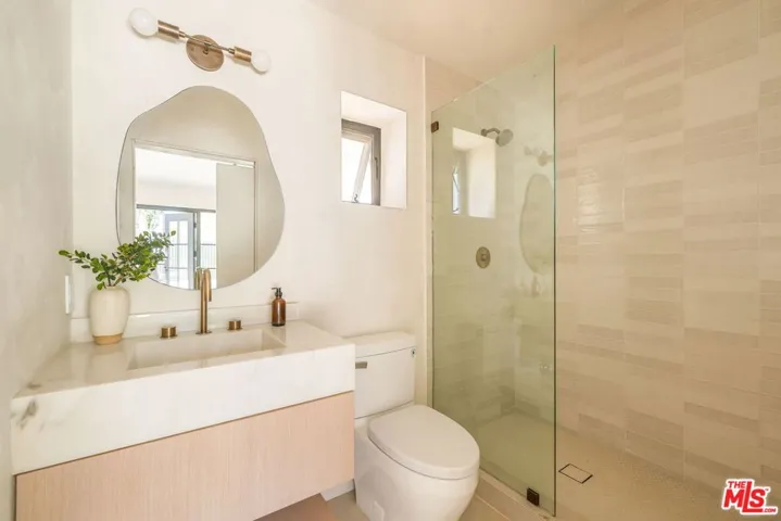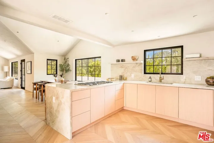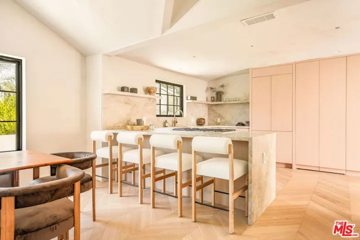Tucked into the serene hills above the Sunset Strip by Chateau Marmont, this thoughtfully reimagined residence blends refined materials with modern livability.The interiors are wrapped in Portola limewash, lending warmth and depth to every space. At the heart of the living room, a custom travertine gas fireplace offers anunderstated focal point, balancing elegance with comfort. Generous outdoor spaces anchor each end of the home, with a south-facing lounge framing sweeping city viewsand inviting seamless indoor-outdoor living. The kitchen pairs solid oak cabinetry with Thermador appliances, anchored by striking leathered Taj Mahal stone countertops.The bathrooms are adorned with large-format porcelain slabs, along with custom integrated sinks and vanities. Underfoot, engineered European oak chevron floors bring asense of rhythm and continuity throughout the home. The property is pre-wired for speakers in both the three-bedroom main house and the ADU. All this, only momentsfrom the world class shopping and dining that West Hollywood and Beverly Hills have to offer.