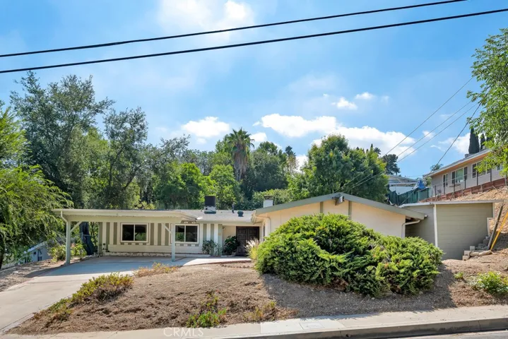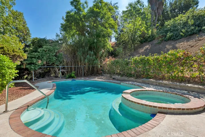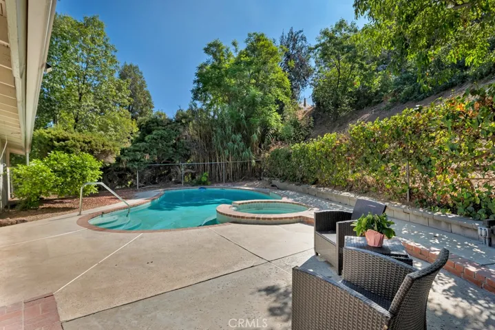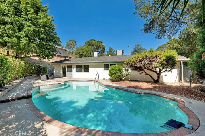 Welcome to this spacious Carlton Terrace pool home! This 4-bedroom, 2-bath, 2,125 sq. ft. single-story ranch offers endless opportunities to make it your own. Step through the bright double-door entry into a foyer that opens to generous living spaces, including a large eat-in breakfast nook, U-shaped kitchen with quartz countertops and bar, formal dining room, a living room with floor to ceiling brick fireplace, and an additional family room created from the permitted garage conversion. Vaulted ceilings in the living and dining areas enhance the open, airy feel while providing views of the sparkling pool and spa.
