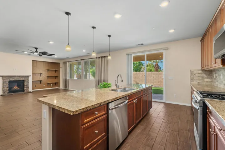 Picture yourself in this spacious five bedroom, four bathroom home in the securely gated community of Aliante in North Indio. Experience the perfect fusion of luxury, comfort, and convenience in this property. Expansive high ceilings and an open floor plan enhance the sense of space. Relax and unwind with five bedrooms plus a versatile bonus room for family or guests with the added convenience of four bathrooms. Stunning mountain views with low HOA fees and zero Mello-Roos taxes make this affordable luxury living. Chef-inspired kitchen with granite countertops and stainless steel appliances Elegant fireplace to add warmth and sophistication. Convenient walk-in pantry and spacious covered patio for outdoor leisureEasy-care artificial turf ensures a beautiful yard throughout the year. Engage in recreational activities at the community park equipped with basketball courts, soccer field, and play areas Prime location with nearby shopping and dining; everything you need is within reach. Effortless access to the I-10 freeway for convenient commuting. This home also equipped with solar panels (production payments range $90-$130 month per month!) Perfect for family life or investment opportunities.
