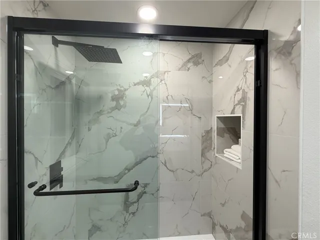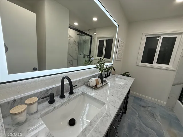 Remodeled bathroom with a contemporary vanity with marble countertop, new tiles, modern shower heads, and faucets