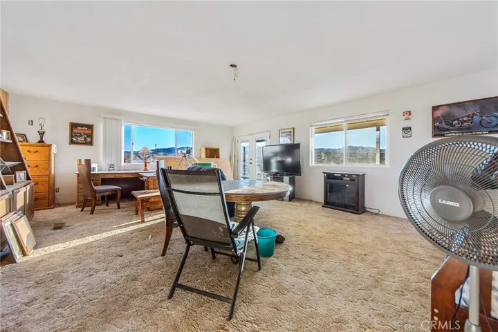 Upstairs, the spacious loft serves as a second bedroom or creative space, complete with its own private bathroom and access to a large deck offering sweeping views of the high desert landscape.