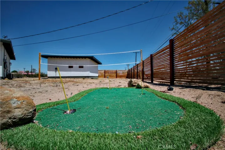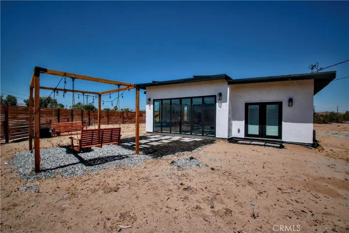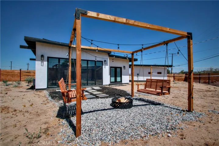 This 1,205 sq. ft. contemporary retreat blends smart home technology, full-electric efficiency, and a fully paid 7kW solar system with the timeless beauty of the desert landscape. Featuring 2 spacious bedrooms, 2 bathrooms, and an airy open-concept layout, the home sits on a generous 13,500 sq. ft. lot, offering ample room for both relaxation and entertainment. As you arrive, a custom carport with two inviting swings sets the tone for the playful yet peaceful atmosphere. Inside, the designer kitchen and living area flow seamlessly to accordion glass doors that expand the space onto your private backyard haven. Here, you’ll find a BBQ area with a grill ready to cook, a cozy fire pit, a volleyball court, and space for mini golf and cornhole.