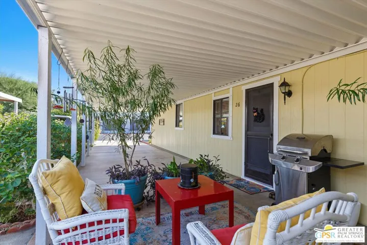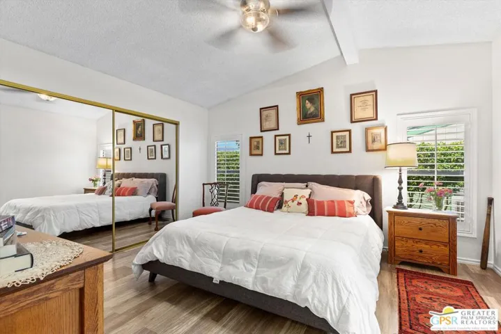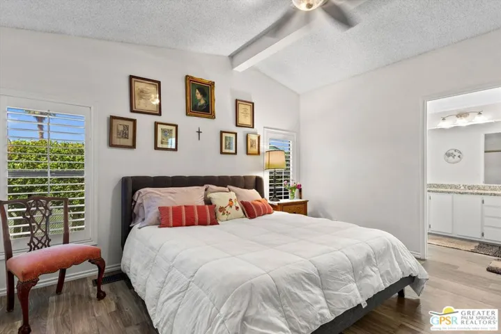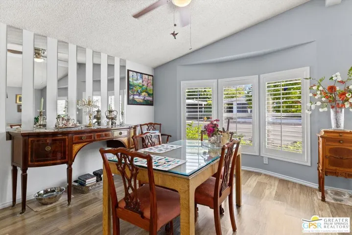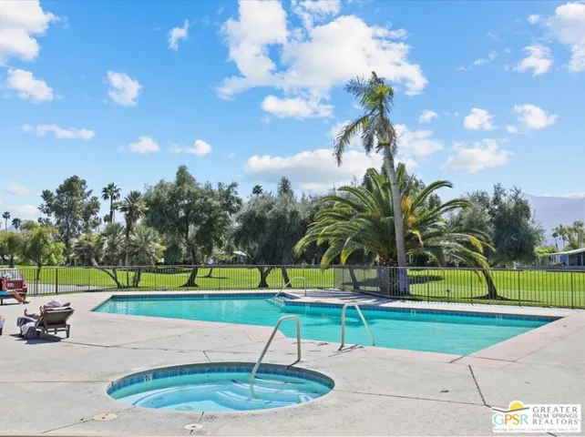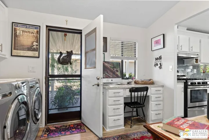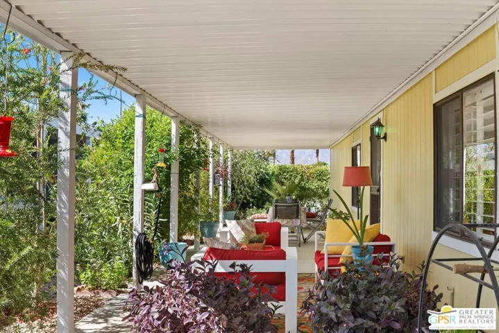 Embraced by colorful gardens, mountain views and shaded outdoor spaces on both sides, this move-in-ready residence elevates indoor/outdoor living to new heights at Palm Desert’s 55-and-better Suncrest Country Club. Built in 1986, the manufactured home is open and bright, with two bay windows welcoming natural light into the seamless living and dining room space and vaulted ceilings lending a sense of openness throughout. Approximately 1,344 square feet, the residence showcases newer woodgrain laminate flooring, upgraded granite countertops in the kitchen and baths, a NU Aqua water filtration system, plantation shutters, mirrored wardrobe doors, ceiling fans and fresh paint. The kitchen flows directly to the dining room and hosts white cabinetry, stainless steel appliances, a peninsula, and full tile backsplash. An oversized laundry room off the kitchen opens to the outdoors and presents a built-in desk with granite top. Two private bedrooms and two baths include a spacious primary suite with generous closet, a soaking tub and separate shower. Settled in a quiet and serene area of the community, this lovingly maintained home offers a seating area, large storage space and golf cart parking on the carport side, while the entry side features a full-length patio that is primed for entertaining. Located in the western end of Palm Desert near Rancho Mirage and Palm Springs, Suncrest Country Club is home to a luxurious clubhouse with billiards, library, pro shop and the popular Jazzy J’s cafe. Residents appreciate having easy access to three swimming pools, in-ground spas, lighted tennis and pickleball courts, and a gorgeous 9-hole golf course. Premium resorts, abundant shopping, countless restaurants, and Eisenhower Medical Center are moments from home.