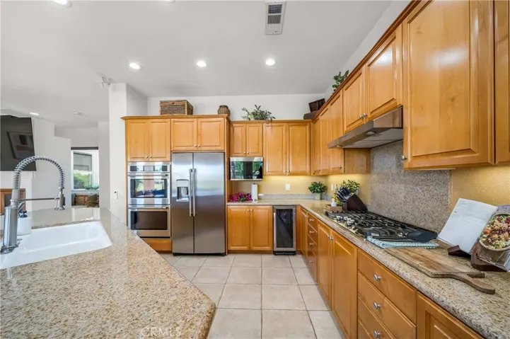 Inside, expansive windows frame golf course views and bring natural light into every room. The great room features soaring ceilings and a cozy gas fireplace, flowing into a well-appointed kitchen with upgraded appliances including a gas range, refrigerator, dishwasher, microwave, and ice maker. Upgrades throughout include a tankless hot water heater, misting system, automatic window fixtures, new garage doors, and newer HVAC systems for year-round comfort.