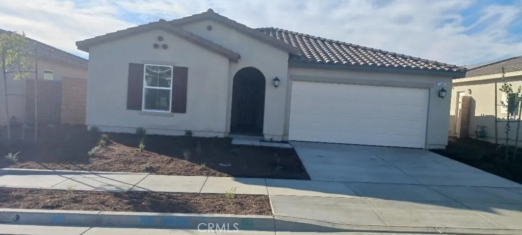 New Spanish style single story home built in November 2023. 3 bedrooms and 2 full bathrooms and 2 attached car garage large with large backyard. Crisp white cabinets with granite kitchen countertops. Spacious great room, large master bedroom, walk-in closet, inside laundry room, tankless water heater, Energy STAR certified homes tested and verified by third party inspection. Minutes to 215 via HWY 74 walking distance to local elementary and high school, shopping and dining nearby at Menifee Courtside Market Place and Menifee Town Center. SunPower solar 12 panels with 405 watt panel. New Whirlpool stove stainless steel, microwave stainless steel, dishwasher stainless steel included, double sinks in master bathroom, kitchen island.