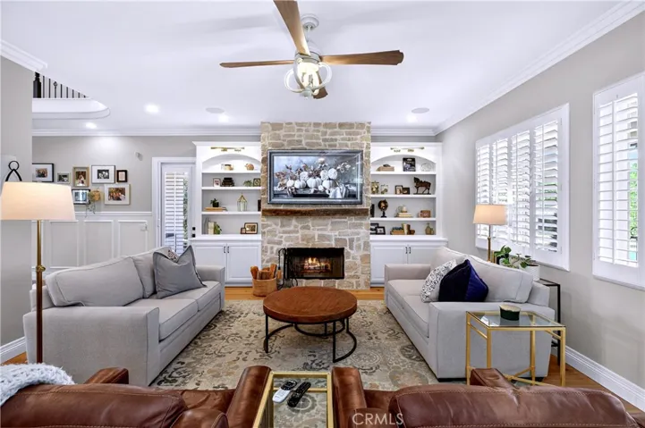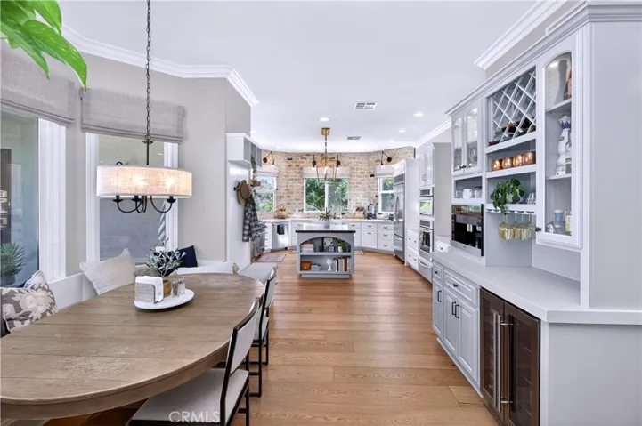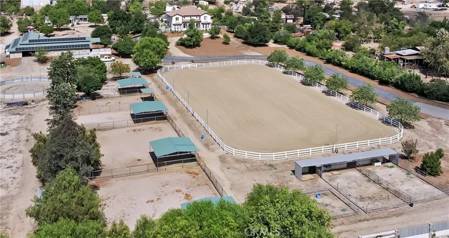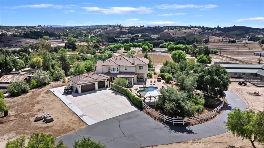 Welcome to Fallen Oak Ranch—an extraordinary equestrian estate perfectly situated in Temecula’s Wine Country, just minutes from award-winning wineries, restaurants, & shopping. The custom-built main residence blends rustic charm with modern sophistication. The designer chef’s kitchen is a showpiece with exposed brick walls, sleek quartz counters, a rich wood-topped island with built-in storage, farmhouse sink, & top-of-the-line stainless appliances including a professional-grade range & oversized refrigerator. Gold hardware, custom cabinetry, & designer lighting create a warm yet refined atmosphere—ideal for entertaining or everyday living. The formal dining room is timeless & inviting with custom wainscoting, soft wallpaper, exposed beams, & a statement chandelier. Natural light pours through plantation shutters onto warm wood floors & a built-in buffet with open shelving—perfect for elegant dinners or festive gatherings. The family room offers relaxed sophistication with a stone fireplace, custom built-ins, & natural light. Plantation shutters, crown molding, & wood floors complete the picture, creating a space that’s both stylish & comfortable.
