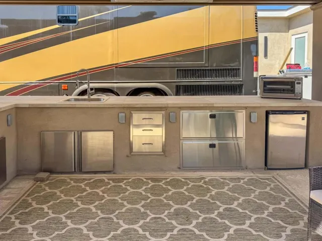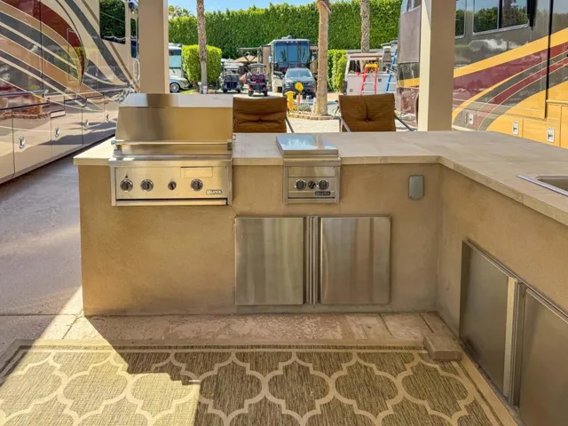 This luxury RV lot at Outdoor Resort Indio boasts stunning golf course views, an extended alumawood pergola with a solid roof, and a spacious outdoor kitchen, creating the perfect setting for upscale resort living. The large L-shaped kitchen, complete with stainless appliances and a built-in bar, sits under the pergola, offering both shade and comfort. Two ceiling fans and two ceiling heaters ensure year-round enjoyment, while the paver lot extensions provide extra space for relaxation and entertainment. An eight-chair dining table and a four-seat tall table with an umbrella offer ample seating, making this lot ideal for hosting and unwinding in style.Outdoor Resort Indio is a Class A only RV resort.