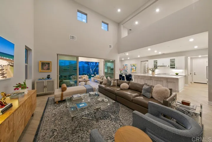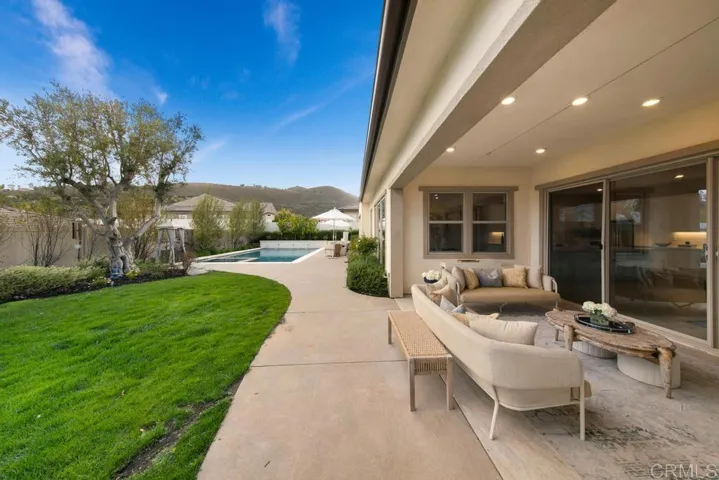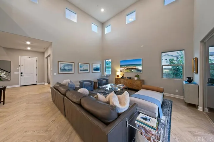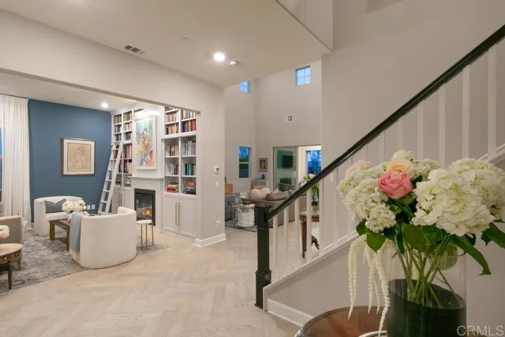 Step into a realm where curated luxury meets the serene, sun-drenched ambiance of this exquisite corner lot home in Harmony Grove Village. This residence is not just a home; it’s an immersive lifestyle experience, meticulously crafted for those with discerning tastes. Over $300,000 in bespoke enhancements have transformed this property into a haven of refined elegance, where every detail resonates with sophisticated living. What sets this home apart are the stunning Spanish Olive Trees from a rare grove that anchor the landscape with timeless elegance. Five mature Manzanillo olive trees, each over 80 years old, were originally cultivated in Sonoma Valley and carefully transported into place. These majestic specimens evoke the charm of a Mediterranean estate, with sculptural trunks and a silvery canopy that catches the light beautifully, day or night. These opulent olive trees provide not just shade and serenity but also a sense of rooted history and effortless luxury rarely found in Southern California homes—a true signature feature of the grounds. This exquisite home features four bedrooms and four and a half baths, including a two fully en-suite bedroom on the main floor which includes the Primary Suite, offering unparalleled convenience and privacy for guests or multi-generational living. Inside, the atmosphere shifts to one of sophisticated intimacy. The elegant library, with its custom-crafted built-in bookcase and fireplace feature wall, serves as an architectural centerpiece designed for both beauty and function. Framed by rich, deep-toned walls, the light gray millwork exudes timeless sophistication, perfectly showcasing an expansive collection of books, décor, and art objects. Symmetrical shelving offers ample space, while a charming ladder enhances accessibility. At the heart of this refined space, a fireplace anchors the room, topped by a gallery-lit art niche that draws the eye upward, creating a curated, gallery-like ambiance. Hidden cabinetry below provides seamless storage, enhancing the room’s clean, luxurious aesthetic. Whether entertaining or unwinding, this intimate space is a sanctuary of style—ideal for quiet nights or refined gatherings. Beneath your feet, chalet white oak herringbone floors flow seamlessly throughout the main living area. The home features a spacious loft with an open wall that overlooks the lower level. The master bedroom, also on the main floor, boasts two closets and lovely views of the backyard. The dedicated dining room offers a picturesque view of the beautifully landscaped outdoor space. The huge center island, topped with white quartz, serves as the heart of this open floor plan. Step outside to the covered loggia with a fireplace that leads to a resort-style backyard oasis. The recently added pool and spa, a shimmering expanse of azure, are framed by olive and lemon trees, complemented by a cascading water feature. This private escape invites you to slow down and bask in serenity. Custom porch swings, suspended by nautical ropes, sway gently in the breeze, inviting moments of quiet reflection. Raised garden beds, bursting with vibrant blooms, add a touch of organic beauty and functionality. Enjoy the added benefit of fully paid solar panels, ensuring energy efficiency and sustainability.