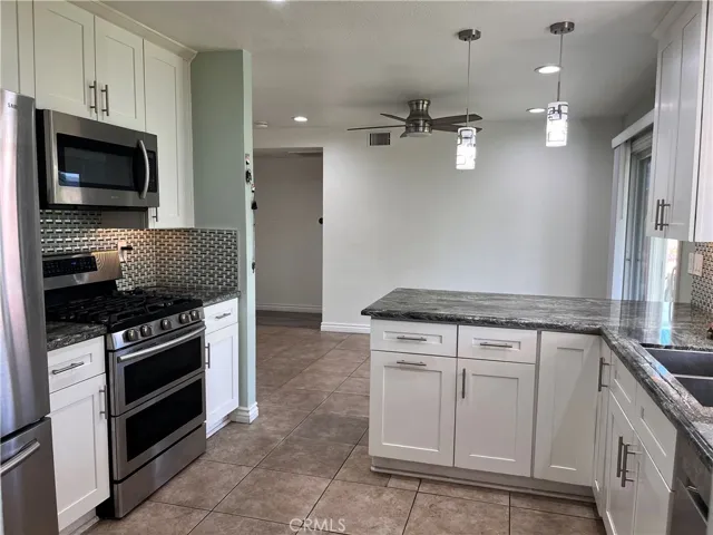 Welcome to this updated 3 bedrooms 2 bathrooms home located in a nice quiet area of Canyon Country. The large living room features a bay window that looks out to the front of the house with sliding doors leading to the porch and backyard. The home has an updated kitchen with newer cabinets, granite counter tops, and newer stainless steel refrigerator, stove, dishwasher appliances and it opens to the dining room with a nice kitchen island. The sliding door in the dining room opens to the beautiful backyard. The backyard is really tranquil and inviting with lots of fruit trees and a large covered patio for those family and friends gathering events. The home has recessed lights throughout living and dinning room. The entrance, dining room, two bathrooms and the kitchen have tile floors. The living room and bedrooms have laminate flooring. The primary bedrooms and the two bedrooms have fans with lights and mirrored closet doors. There is a bonus room with an AC in the garage that can be used as an office. Great Comfortable home.